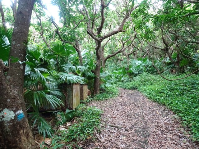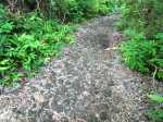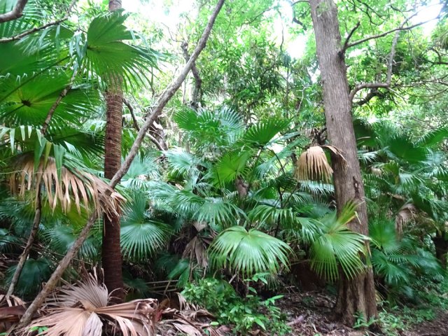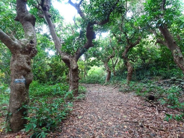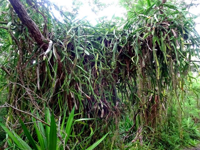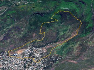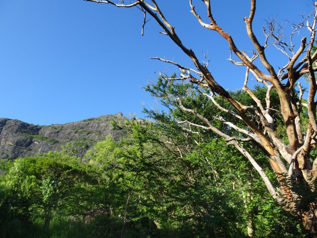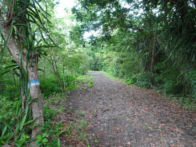 La randonnée débute à un parking d'une dizaine d'emplacements avant la chaîne barrant le passage vers la route. Un panneau schématise les circuits possibles avec quelques explications. Sur le côté quelques modules sont utilisés par les sportifs en début ou fin d'entraînement. Trouver le sentier qui commence près des toilettes en direction de la ville (Photo 1). Il est un peu encombré de plantes mais encore utilisé par les habitants pour éviter de marcher longuement dans les rues. La carte en main, partir à gauche sur Cremation Groung Street puis rejoindre le départ du circuit en direction du Pouce en traversant des quartiers populaires. Les vues sur la montagne permettent de reconnaître le Snail Rock ou, plus à gauche, Le Pouce souvent dans les nuages au petit matin (Photo 2). Quelques cases très modestes ou abandonnées, bordées de détritus, longent le début de la montée confirmée par quelques taches de peinture blanche sur les rochers. La pente est faible sur ce qui fut une piste désormais inutilisée et envahie par quelques herbes (Photo 3). Les arbres ne cachent pas totalement les sommets dont Le Pouce dont on prend la direction (Photo 4). La piste droite est facile à suivre malgré les herbes (Photo 5). La marche se rapproche du pied de la haute falaise du Snail Rock qu'on devine dans les trouées (Photo 6). La piste est petit à petit remplacée par un sentier envahi de lianes papillon qui poussent en très grandes quantités durant la montée au Pouce (Photo 7). 30 minutes après les cases du départ, on parvient à un croisement avec des panneaux indiquant les distances et temps vers diverses destinations. Délaisser le sentier de droite et emprunter celui de gauche (Photo 8). Le sentier est d'abord assez plat dans les lianes, heureusement taillées régulièrement (Photo 9). On retrouve des traces de l'ancienne piste qui servait pour les cultures au siècle précédent (Photo 10). Impossible de s'égarer tant les lianes poussent dru et envahissent les arbres qui meurent en quelques années (Photo 11). On ne quitte plus cette piste pavée souvent de bonne qualité. Il subsiste même des travaux de soutènement ou d'évitement de ravines (Photo 12). Le parcours traverse de plus en plus de belles forêts. Les lianes diminuent par endroits. Les eucalyptus deviennent plus nombreux que les autres arbres (Photo 13). Ils sont remplacés plus loin par les poiriers marrons (Tabebuia heterophylla) qui atteignent par endroit des tailles imposantes. Profiter des dernières portions plates sur cette trace mi-sentier, mi-piste (Photo 14). Une descente débute. De grandes ornières creusées par les crues et fortes pluies ont abîmé la piste qu'on arrive cependant à suivre en prenant garde à la glissade. Certaines ornières approchent les deux mètres de profondeur. La remise en état de la piste est difficilement envisageable sans d'énormes investissements. La descente est bordée cette fois de nombreux palmiers dont les fruits doivent attirer les singes (Photo 15). On retrouve également les manguiers en bordure de sentiers qui confirment que la zone était cultivée (Photo 16). On parvient un peu plus loin à une grande clairière d'où l'on peut apercevoir des quartiers de Port Louis (Photo 17). On retrouve les flancs du Snail Rock que l'on suivait de plus près dans la montée (Photo 18). Partir sur la droite. Escalader quelques branches tombées sur le sol et parvenir à un nouveau verger de manguiers (Photo 19). On arrive ainsi au croisement de la petite boucle de Dauguet. Un panneau sur la gauche indique plusieurs directions (Le Dauguet, Le Pouce et Moka Range Chalenge). Très près, le kiosque attend les rares pique-niqueurs obligés de porter longuement leur nourriture sur le dos (Photo 20). Près du kiosque une esplanade permet de faire demi-tour aux véhicules autorisés (Photo 21). Un grand figuier étrangleur en marque le début (Photo 22). On devine un peu plus loin un temple sous de grands arbres. Les offrandes, sous forme de nourriture et surtout de fruits, attirent une trentaine de macaques crabiers peu farouches (Photo 23). On reste sous des manguiers tortueux mais on ne pourra pas cueillir de fruit depuis longtemps consommés par les primates (Photo 24). La piste s'élargit de nouveau et il faut éviter les pierres qui dépassent (Photo 25). Par moments, des cactées ont envahi la cime des arbres allant jusqu'à faire craquer les branches sous leur poids (Photo 26). La fin de la piste devient une promenade reposante dans la belle forêt, sur un sol plus sableux, totalement plat (Photo 27). Elle reste plate jusqu'à l'eucalyptus planté au croisement des sentiers de la petite boucle de Dauguet (Photo 28). Encore quelques mètres de piste et on arrive sur la route goudronnée bordée de nombreuses barrières en bois menant au parking du départ de cette grande boucle de Dauguet.