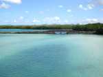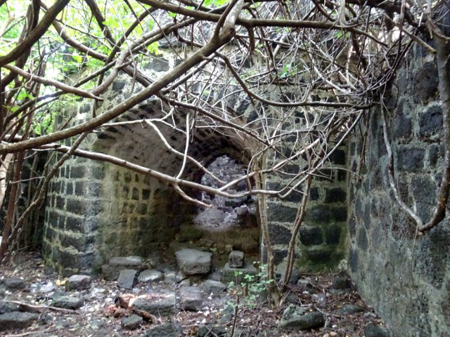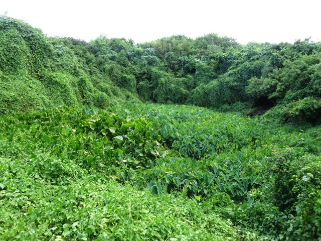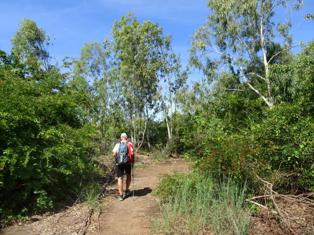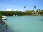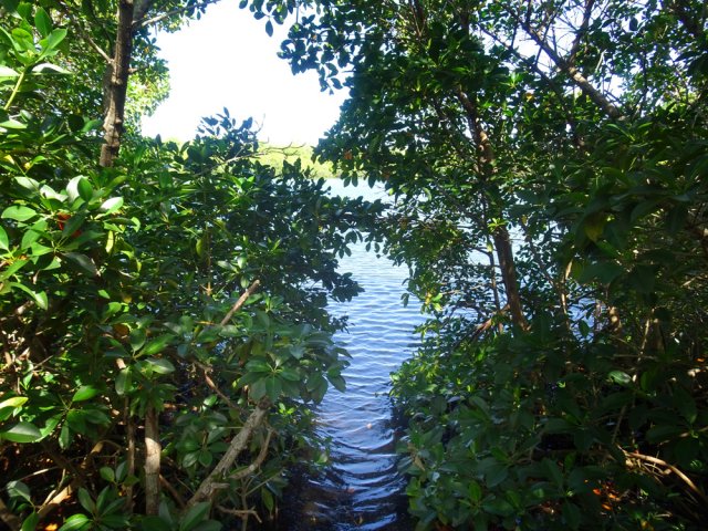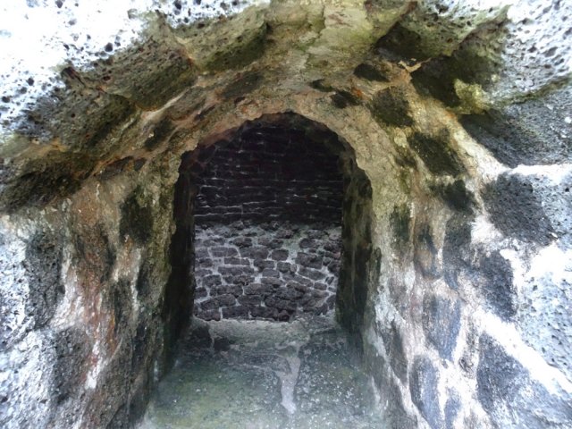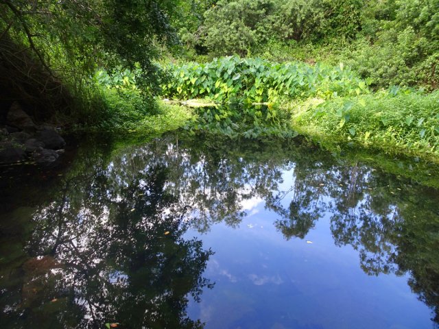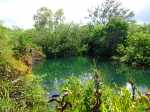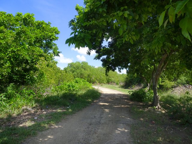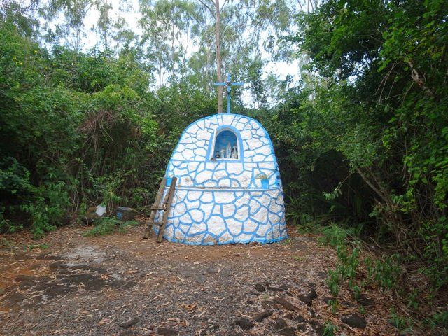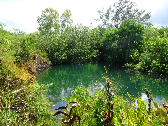 La randonnée débute près de l'église. Avant de stationner, repérer sur la carte la grotte Madame à l'entrée du village. On descend à la grotte remplie d'eau par des escaliers, pour une visite rafraichissante si des courageux osent s'y baigner (Photo 1). Après la visite et le stationnement près de l'église, marcher un peu sur la B15 pour profiter des jolies vues sur la baie (Photo 2). La visite de l'église est possible lorsque le portail est ouvert aux heures fixées. Le petit bâtiment récent est sous quelques filaos (Photo 3). Côté lagune, on remarque une route qui traverse l'étendue d'eau (Photo 4). Elle mène à une propriété bordée de cocotiers (Photo 5). En empruntant la piste entre lagune et église, on peut se rapprocher de cette route traversante à l'ombre de quelques arbres (Photo 7). Aucun panneau d'interdiction n'empêche de se rapprocher des cocotiers mais il est plus respectueux d'en rester éloigné et de faire demi-tour une fois sur le pont (Photo 8). Revenir à l'église et emprunter la piste qui la longe. C'est une des rares parties de la randonnée qui se trouve à l'ombre (Photo 9). Après le mur d'enceinte d'une propriété, on se retrouve dans une savane peuplée de quelques faux poivriers (Photo 10). Aucune difficulté pour suivre le sentier, plus fréquenté par les jeunes du quartier que par les randonneurs (Photo 11). La marche s'effectue totalement à plat, sans effort hormis la chaleur. On parvient à quelques eucalyptus (Photo 12). Prendre à gauche à la première bifurcation et marcher sous le couvert des arbres. On parvient très vite au premier bassin d'eau sombre (Photo 13). La baignade n'y est pas très tentante même si le bassin est fréquenté. Il n'y a pas de plage et l'accès est assez difficile dans la végétation (Photo 14). En poursuivant par le sentier et en se baissant un peu pour éviter les branches, on parvient de l'autre côté de la grande lagune aperçue depuis la route (Photo 15). Faire demi-tour et reprendre la progression. On remarque très vite des murs en ruine derrière les lianes et arbustes épineux (Photo 16). En cherchant un peu, on repère très vite les sentiers créés par les curieux, amateurs de ruines. On repère cette fois la fenêtre d'une grande tour (Photo 17). Il s'agit d'un four à chaux dont on peut également s'approcher en passant par cette fenêtre. L'intérieur dévoile une architecture de pierres de laves taillées, remarquablement conservées (Photo 18). On peut pénétrer dans ce four, en sortir par la porte et remarquer l'incroyable épaisseur destinée à conserver la chaleur élevée dans le four (Photo 19). Une deuxième tour se dresse tout près. On peut cette fois y pénétrer par la porte, tout aussi épaisse que la précédente (Photo 20). Les milliers de degrés accumulés durant les années d'exploitation ont un peu plus abîmé la structure mais l'ensemble est assez solide pour envisager une remise en état (Photo 21). La fenêtre est ici plus difficile d'accès et impose de ressortir par le bas (Photo 22). Continuer l'exploration et repérer les tours en s'en éloignant (Photo 23). Le bruit que font les jeunes ou les engins garés sur le côté évitent de trop chercher son chemin. On tombe sur un nouveau trou d'eau mais également trop encombré de taros pour envisager une trempette (Photo 24). Tout près, le plus connu et le plus fréquenté est rempli d'une eau plus claire qui incite à la baignade (Photo 25). En cherchant un peu dans les parages on a vite fait de découvrir de nouveaux trous d'eau, souvent très envahis de toutes sortes de plantes aquatiques (Photo 26). L'endroit abrite soit-disant une grotte. En demandant aux jeunes, ils indiquent aussitôt un chemin empierré et conseillent de marcher jusqu'au bout (Photo 27). La grotte s'avère n'être qu'un oratoire dédié à la Vierge au fond de sa niche bleue. Cette allusion à Lourdes a certainement donné le nom de grotte au petit édifice (Photo 28). Le chemin se poursuit en direction du village mais les trous d'eaux caractéristiques ont tous été aperçus. On peut donc faire demi-tour par le chemin le plus direct pour revenir au véhicule avant de se rendre, ou non, aux 6 entrées de Princess Margaret Cave, à condition d'être équipé de lumière.