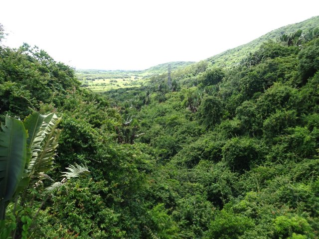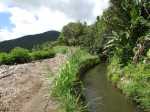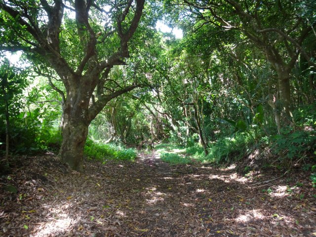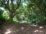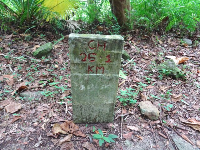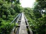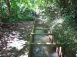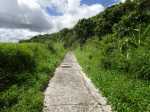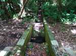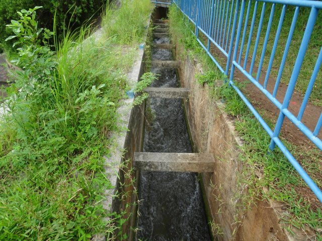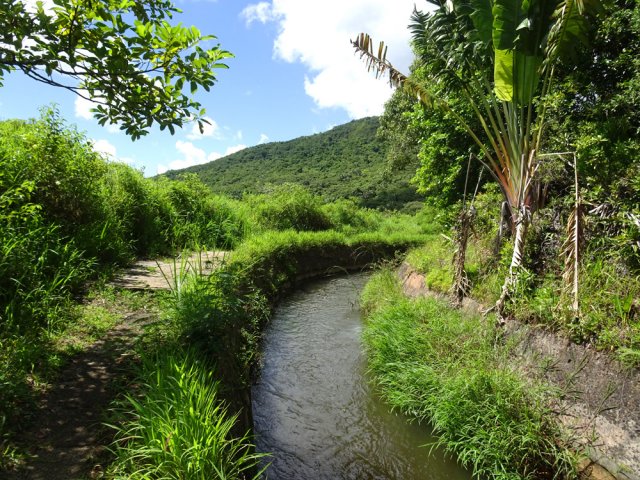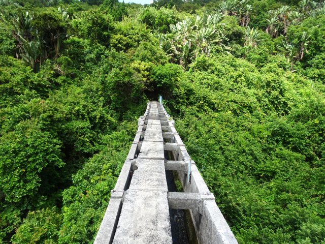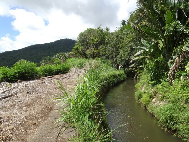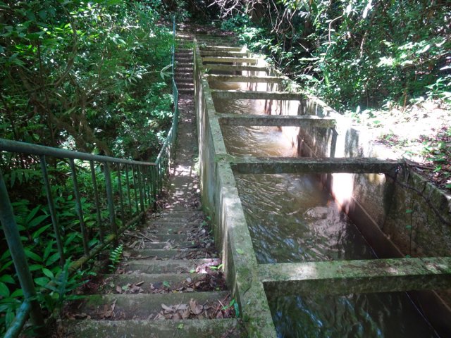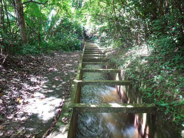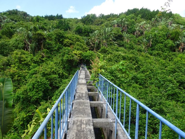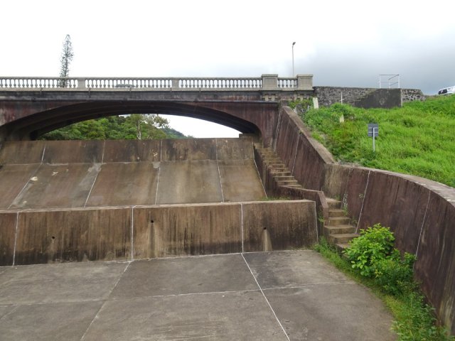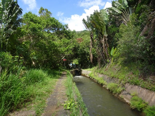 La randonnée débute au parking proche du pont enjambant le trop-plein du réservoir. Avant de partir, rejoindre l'extrémité du ponton pour bénéficier de belles vues sur le lac artificiel, les montagnes et forêts qui l'entourent (Photo 1). Après cela, il est également possible de descendre sous le pont pour voir l'architecture du trop-plein (Photo 2). Repérer également les bassins destinés à freiner l'eau en provenance du canal (Photo 3). Rejoindre ensuite l'oratoire bâti en bordure de route à la fin du canal. De là, on peut apercevoir la dizaine de mètres du canal où l'eau coule assez fortement (Photo 4). C'est parti pour 2 bons kilomètres totalement plats. Très vite, le canal est recouvert de longues plaques de béton destinées à protéger l'eau des feuilles et de la terre qui pourraient la polluer (Photo 5). Un coup d’œil sur le réservoir permet d'en apprécier la surface (Photo 6). La randonnée est une balade sur ce chemin de béton bordé de quelques beaux arbres (Photo 7). Des regards sont installés régulièrement pour accéder au cours d'eau souterrain afin de nettoyer (Photo 8). La forêt occupe la rive gauche de l'ouvrage enterré. En rive droite on bénéficie de plus en plus de panoramas sur les cultures, friches et champs de canne à sucre (Photo 9). A peine a-t-on commencé qu'on se retrouve devant une borne indiquant que, depuis 26 km, l'eau coule dans le canal (Photo 10). Une excellente occasion d'étudier le parcours et revenir tenter d'effectuer l'ensemble du trajet. Par endroits, le canal est recouvert de terre ou de plaques de béton juxtaposées (Photo 11). On remarque également de nouveaux petits canaux perpendiculaires chargés d'alimenter le principal en cas de fortes pluies (Photo 12). Après 1 km, plus de traces de béton. On marche sur un agréable chemin de terre bordé de manguiers et autres grands arbres (Photo 13). Plus loin, malgré la proximité de la forêt, on retrouve l'eau courante sans protection (Photo 14). Ces portions découvertes sont assez courtes. On retrouve les plaques facilitant la marche (Photo 15). La fin de cette courte sortie longe un canal visible en direction de quelques collines entourant le lac (Photo 16). On s'approche enfin du Jamblon Bridge qu'on devine sous les arbres (Photo 17). Au début, l'ouvrage doté de barrières de protection ne déclenche aucune crainte (Photo 18). Au milieu de la passerelle, les barrières disparaissent (Photo 19). L'eau coule sous le passage bétonné mais l'espace de marche est suffisamment large (Photo 20). On domine d'une quinzaine de mètres la rivière mais les lianes papillon empêchent d'en observer le lit (Photo 21). Comme il n'y a plus de rambarde, les personnes souffrant d'acrophobie feront demi-tour. Les autres prendront garde à bien rester sur la bande bétonnée pour atteindre l'autre rive (Photo 22). On retrouve un semblant de barrière de l'autre côté mais le plus difficile est terminé (Photo 23). La passerelle franchie, le canal se poursuit avant d'obliquer sur la gauche. On marche à côté et non dessus comme depuis le départ (Photo 24). On remarque des ouvrages bétonnés pour franchir une nouvelle petite ravine (Photo 25). Ces installations signent la fin de la randonnée. Faire demi-tour, franchir le Jamblon Bridge et refaire le chemin inverse jusqu'au réservoir de la Nicolière.