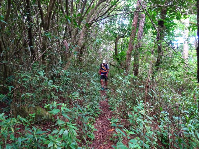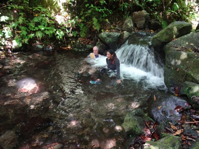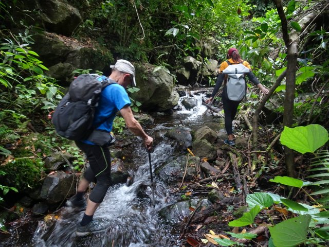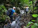 La randonnée débute au réservoir de la Nicolière. Visiter les installations et les abords avant de se lancer dans cette courte aventure. Voir si nécessaire la fiche sur la première partie de cette boucle. La marche s'effectue totalement à plat le long du canal alimentant le réservoir. On le longe parfois lorsqu'il n'est pas couvert de béton (Photo 1). Cette promenade n'est pas assez difficile pour préparer la remontée sportive du torrent et de ses cascades (Photo 2). Après 2 kilomètres de promenade, on parvient à une passerelle canal enjambant une ravine, affluent de la Rivière des Remparts. Le Jamblon Bridge débute sous les jamrosats bordant la ravine (Photo 3). Son franchissement comporte quelques risques si les jambes flageolent. Prendre garde là où il n'y a plus de rambarde et éviter même de s'appuyer sur celle en place (Photo 4). De l'autre côté, poursuivre un peu le long du canal jusqu'à ce que celui-ci oblique à gauche. Trouver dans le sous-bois un petit sentier discret partant sur la droite. Peu fréquenté, il est cependant facile à deviner. On parvient en quelques minutes au ruisseau où l'on rencontre les premiers captages (Photo 5). Rester au plus près de l'eau et rejoindre la première chute de la montée. Elle fait moins de 10 m et ne possède pas de bassin. Pas de sentier pour la contourner. Il faut repérer la corde en rive gauche et se hisser à la force des bras (Photo 6). On tombe immédiatement sur une autre chute se contournant en rive droite (Photo 7). La trace sur la berge est discrète mais on peut toujours la suivre à l'instinct. Elle mène à une troisième petite cascade protégée par un arbre qui empêche de s'en approcher facilement (Photo 8). Le contournement, toujours en rive droite, passe entre d'énormes lianes papillon qui obligent à se contorsionner en prenant garde à ne pas glisser vers la cascade (Photo 9). Plus haut, la prochaine est un haut toboggan tombant sur des roches basaltiques (Photo 10). Là également, la poursuite vers l'amont est une aventure au milieu des lianes grosses comme des cuisses, sur un sentier glissant et très étroit (Photo 11). La cinquième cascade est assez esthétique, mi-chute, mi-toboggan dont une partie file dans un tuyau de prise d'eau (Photo 12). L’échappatoire est aussi sportive que pour la première. Heureusement une corde permet de passer l'obstacle abrupt (Photo 13). Après un très court cheminement, on arrive à la cascade n°6, aussi discrète que les autres (Photo 14). La prochaine n'est pas comptabilisée puisque c'est l'écoulement d'un petit barrage de recueil (Photo 15). D'anciens barbelés et une porte symbolique, départ d'un sentier d'entretien, indiquent que le lieu fut sans doute protégé à une certaine époque (Photo 16). A partir du barrage, le sentier est difficile à suivre ou disparaît. Poursuivre donc par le torrent, marcher le plus souvent dans l'eau en prenant garde aux roches glissantes (Photo 17). On arrive plus haut sur le seul véritable bassin de la journée où l'eau très fraîche ne rebute pas tous les randonneurs (Photo 18). Après le bassin, on poursuit la montée en direction de la septième chute. Il s'agit en réalité de la source du ruisseau surgissant d'un petit tunnel caché dans la végétation (Photo 19). L'eau est encore plus fraîche que dans le bassin (Photo 20). La montée au petit tunnel est assez acrobatique. Poursuivre vers l'amont en partant sur la droite pour affronter une rude montée sur d'anciens éboulis instables où le pied a vite fait de glisser (Photo 21). Au passage, remarquer la grotte qui doit abriter les singes lors des forts épisodes pluvieux (Photo 22). Après l'éboulis, on retrouve un sentier classique sur les racines et l'on arrive dans une partie boisée (Photo 23). Le sentier, plus fréquenté, permet aux habitants de se rendre à la source et peut-être au bassin (Photo 24). La traversée de la forêt, presque plate, se fait facilement après l’effort de la montée (Photo 25). On entend passer les véhicules sur la B49 et on quitte bientôt le couvert des arbres (Photo 26). La circulation est variable en fonction des jours de la semaine. Prendre à droite et entamer la longue descente des deux lacets sur une large route, agréable dans la belle forêt (Photo 27). Il n'y a pas de raccourcis pour rejoindre la route en coupant les lacets. La descente se termine dans un véritable tunnel végétal créé par les jamrosats penchés (Photo 28). On rejoint le parking où des vendeurs proposent rafraîchissements et fruits afin de terminer cette boucle sereinement et oublier les efforts de la montée de ravine.