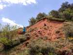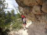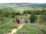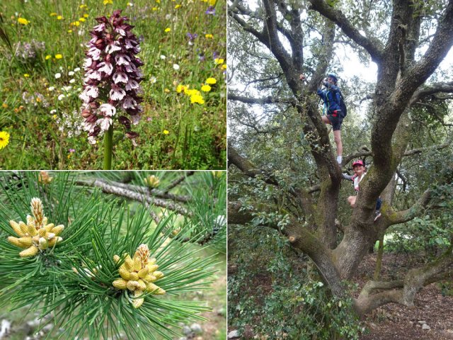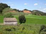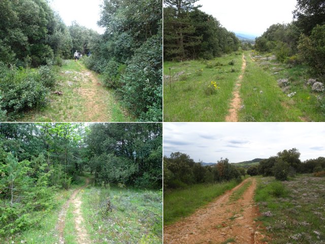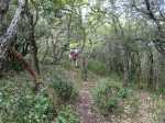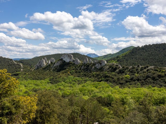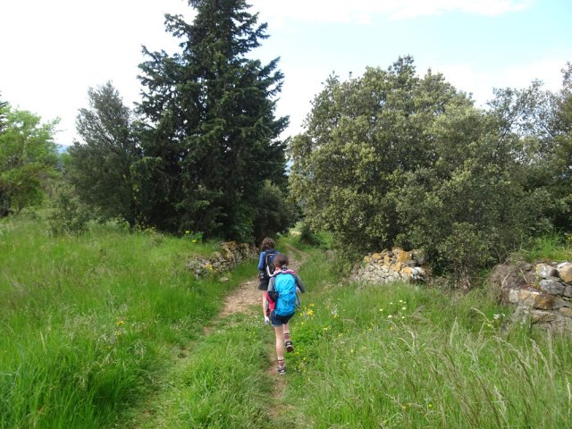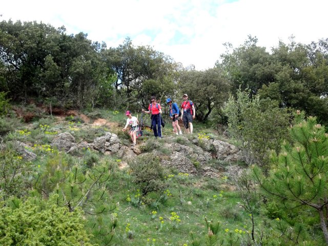 La randonnée débute au parking situé avant le village perché sur sa colline. Garder la visite des vestiges et des ruelles en fin de randonnée. Un sentier débute à l'entrée du parking. Il comporte encore des vestiges de pavages et descend vers le hameau de Labadous entre des murets de pierres sèches (Photo 1). Il tourne à gauche un peu plus bas. Dans le virage, repérer le sentier qui traverse la prairie en direction d'une fontaine à sec ornée de 4 lions. Poursuivre en direction d'une tour qui se détache à une centaine de mètres. Elle est fermée mais mérite le déplacement (Photo 2). Longer ensuite la falaise puis rejoindre le sentier emprunté au départ d'où l'on a de beaux points de vue sur la tour et la falaise (Photo 3). La descente se termine dans les champs entourant le hameau isolé des Labadous. La boucle commence réellement à ce hameau. Emprunter le large chemin recouvert de gravier qui monte parfois fortement en direction de Soubirous (Photo 4). Il effectue un lacet un peu plus haut. Quelques sentiers coupent ce virage. Si la distance est raccourcie, il n'en est rien de la pente assez raide (Photo 5). Aussitôt après le raccourci, quitter le chemin et partir plein sud sur une piste à travers les chênes verts (Photo 6). Ne pas manquer le croisement qui indique à droite le Sentier des Couleurs. Suivre cette nouvelle signalisation. On parvient assez rapidement à un aven en bordure de sentier. Il est possible de descendre dans la cavité pour y repérer la source ou des départs de souterrains (Photo 7). L'aller-retour facultatif aux terres rouges peut se réserver pour une autre randonnée mais le détour ne prend qu'une trentaine de minutes. Poursuivre entre prairies et champs puis passer près d'une bergerie d'où l'on aperçoit les premières terres colorées (Photo 8). On a retrouvé la Route de Soubirous pour une agréable marche à plat (Photo 9). Sur la droite, le village de Rennes le Château domine toujours à l'horizon. La région vallonnée présente autant de roches blanches des falaises calcaires que de terres rouges au milieu des pâturages (Photo 10). Toutes les terres colorées ne sont pas accessibles car occupées par des pâturages mais les enfants peuvent y trouver un excellent terrain de jeu (Photo 11). En poursuivant vers Soubirous, on peut atteindre d'autres spots de terres colorées. Il est difficile de créer un trajet en boucle à partir d'ici, aussi est-il conseillé de revenir sur ses pas en direction de l'aven. On retrouve le sentier plein sud en direction de Borde d'en Salva, tantôt large, tantôt étroit entre les pins (Photo 12). Plus on marche vers le sud et plus la longue barre rocheuse grandit. Elle domine une belle forêt de chênes verts et de chênes classiques aux feuilles plus claires (Photo 13). Passer une clôture électrique et poursuivre, toujours vers le sud, jusqu'aux premières barres rocheuses pour profiter de superbes paysages (Photo 14). Entamer une descente dans les chênes lièges pour se rapprocher du pied des falaises (Photo 15). A la falaise, choisir entre un large sentier fréquenté passant à une vingtaine de mètres en contrebas ou raser la muraille sur un plus étroit mais balisé (Photo 16). Il faut prendre garde à ne pas se cogner la tête. La trace amène parfois en ligne de crête pour admirer la campagne environnante (Photo 17). Il est également possible, sans trop de danger, de grimper même si aucun sentier ne mène au sommet (Photo 19). On peut ainsi admirer quelques aiguilles calcaires (Photo 21) ou ce trou dans la falaise qui se rejoint aisément (Photo 20). A la fin des sculptures naturelles, les sentiers disparaissent et il faut redescendre pour rejoindre le sentier principal en empruntant les traces laissées par les vaches (Photo 22). Partir vers l'est et traverser le Bois du Lauzet. L'emplacement de la fontaine des Quatre Ritous est un véritable marécage qui se traverse les pieds au sec si on prend son temps. Plus loin, on retrouve les sentiers classiques de la région dans les chênes verts. Ne pas manquer les magnifiques points de vue sur le Pech de Bugarach, les forêts et prairies sur près de 2 km (Photo 23). On marche souvent sur la falaise dominant les Boudous et Lavaldieu. Elle est recouverte de crottes de biques qu'on ne tarde pas à rencontrer pour une pause ludique (Photo 24). Repérer également quelques magnifiques spécimens de chênes ancestraux qui amuseront également les enfants (Photo 25). La balade s'effectue presque à plat sur divers sentiers larges et souvent bordés de clôtures électrifiées pour garder les troupeaux (Photo 26). L'arrivée à la Pique de Lavaldieu est un pur bonheur pour les amateurs de panoramas à 320°. Les roches nues qui en occupent le sommet permettent de tout étudier, des petits villages jusqu'au Pech de Bugarach (Photo 27). Le retour, presque constamment en descente, s'effectue sur pistes, chemins, sentiers larges et faciles jusqu'au hameau des Labadous (Photo 28). Profiter des fleurs de tous côtés et de l'odeur du thym avant d’entamer la dernière remontée vers le parking de Rennes le Château.