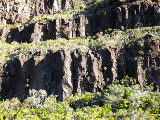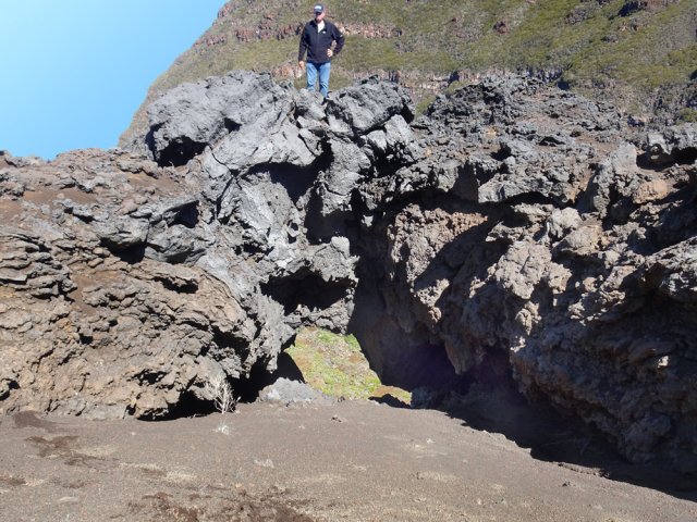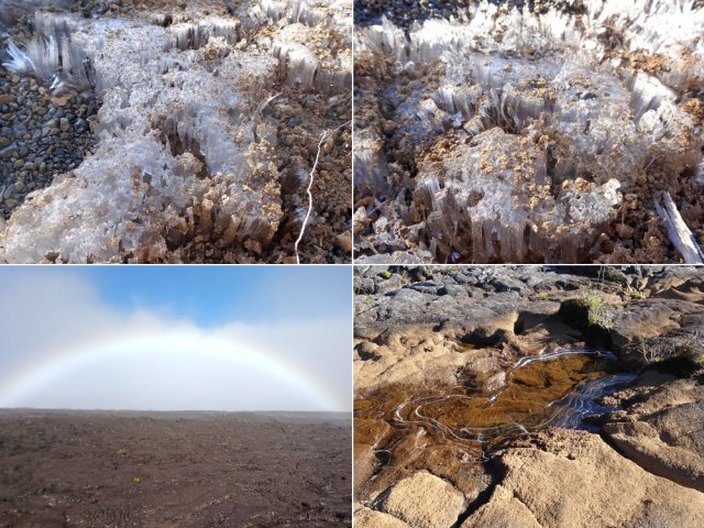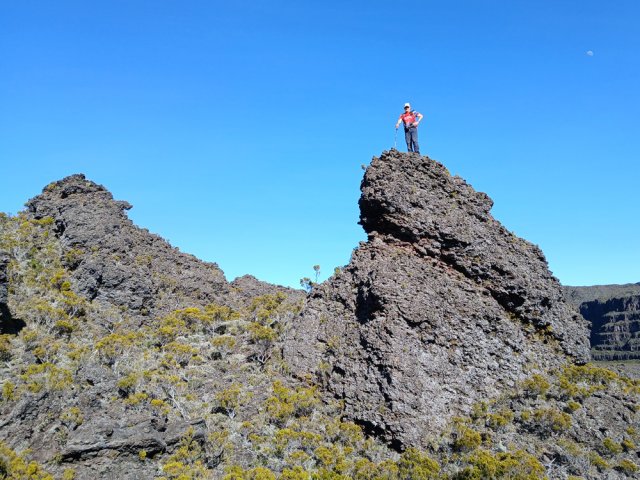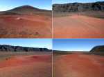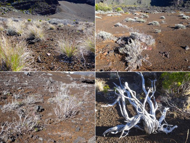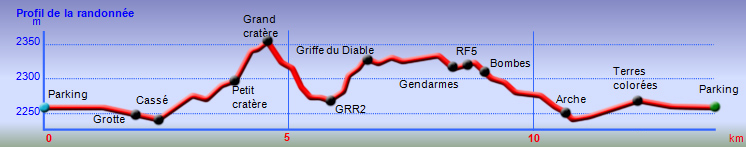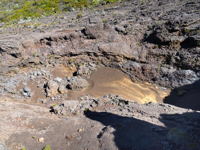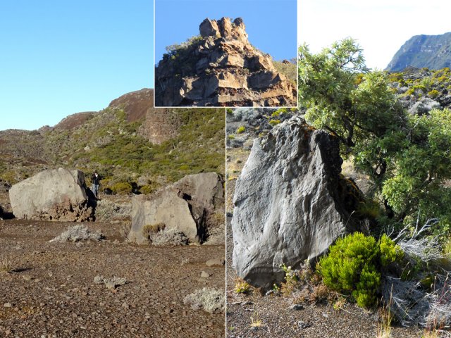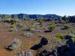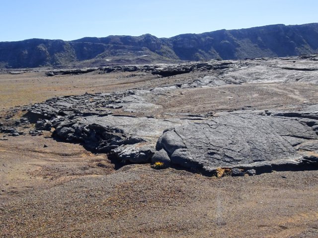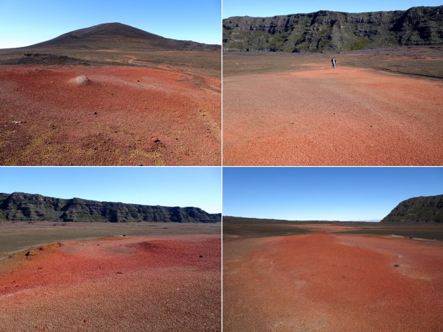 La randonnée débute à la naissance de la Plaine des Sables, à la fin des lacets de la route. Partir plein nord en se rapprochant du Rempart des Sables. Durant l'hiver austral, il est fréquent de commencer à marcher sur le givre qui craque sous le pied avant de fondre très vite aux premiers rayons du soleil (Photo 1). C'est différent avec la glace sur les flaques des ravines ou les cristaux qui soulèvent parfois très haut le sable et les lapilli. Par temps de brouillard, il est également possible d'observer un arc blanc si l'on est situé entre le soleil levant et la brume (Photo 2). La végétation est soit totalement inexistante sur 80% de la plaine, soit se partage entre fétuques, jeunes branles verts ou squelettes d'arbustes morts (Photo 3). En passant au plus près du pied du Rempart des Sables, on traverse à plusieurs reprises des champs de blocs de basalte tombés du haut des falaises encore instables (Photo 4). La plus grande partie de la boucle s'effectue sur un sol très souvent plat sans végétation ou presque (Photo 5). Au passage, repérer le dyke discret dépassant du rempart (Photo 6). Il est loin d'être le plus remarquable de l'île. On rencontre de plus en plus le lit de la Ravine du Piton Rond au fond sableux ou basaltique avant qu'elle se précipite vers le Fond de la Rivière de l'Est. Les laves rencontrées sont très variées. On aura l'occasion, tout au long de la boucle de les voir toutes (Photo 7). Tout près, on distingue quelques orgues basaltiques organisées par couches successives, séparées par des épaisseurs variées de gratons (Photo 8). La ravine devient de plus en plus nette en s'approchant du vide. Sur la rive gauche, un rocher caractéristique esseulé indique l'emplacement de la grotte sous la falaise. Il faut traverser une dizaine de mètres de branles et fleurs jaunes pour rejoindre ce coin de bivouac. Le foyer en pierres est toujours là mais l'endroit semble désormais délaissé (Photo 9). Rejoindre la ravine et atteindre le cassé de la Rivière de l'Est pour de magnifiques vues en direction de la Savane Cimetière et le Fond de la Rivière de l'Est. Attention car la bordure est friable comme le montrent les roches tombées dans le vide (Photo 10). Longer le cassé afin de mieux profiter du Rempart des Basaltes où l'on distingue très bien les couches alternées de basalte et de gratons. Les couches sont apparues après l'effondrement créant la Plaine des Sables il y a 65 000 ans (Photo 11). La partie "aventure" débute au cassé en partant vers l'est. Marcher en direction d'un haut monticule d'une dizaine de mètres très facile à escalader (Photo 12). 15 minutes plus tard, on arrive à de nouveaux blocs qui, comme les gendarmes, ont été poussés par les laves descendant du Piton du Cirque (Photo 13). Du cassé jusqu'au cratère central, la marche se fait à l'instinct sans jamais piétiner une plante, quitte à effectuer des détours de quelques mètres pour les éviter (Photo 14). Après 40 minutes à grimper entre parties sableuses de ravines en formation, affleurements de lave, de gratons, de plantes, on arrive à un ancien cratère qui se remarque à son pourtour de roches empilées. Le centre, désormais ensablé, accueille quelques jeunes branles (Photo 15). En regardant plein sud, on remarque à peine le prochain cratère qui est un des plus originaux de la zone. Ce petit cratère, au centre du plus grand du Piton du Cirque (également nommé Piton Haüy), est plus beau vu du sommet alors que l'on arrive du bas. Après avoir suivi une large bande sableuse, on passe d'abord près d'une longue grotte (Photo 16). Remonter la forte pente glissante pour parvenir sur le bord circulaire du cratère. En faire le tour pour mieux l'apprécier (Photo 17). Repartir à l'ouest et viser une ravine bien nette facile à suivre. Sur le bord, des grottes ont été creusées par l'érosion qui a ôté le sable sous de larges plaques de basalte (Photo 16). On parvient à une concentration de gros blocs à l'emplacement d'une très ancienne éruption. Rejoindre le sentier Josémont Lauret puis poursuivre en direction du col entre le Piton du Cirque et le Demi-Piton. L'endroit se nomme la Griffe du Diable mais aucun monolithe ressemblant à une griffe ne peut y être décelé. Il faut remonter les 20 premiers mètres de la pente du Demi-Piton pour mieux comprendre. Les flancs du Piton du Cirque sont déchirés comme par une monstrueuse patte de dinosaure (Photo 18). Rejoindre ensuite la RF5, la traverser et se diriger vers le piton de scories impossible à manquer à sa couleur rouge. Il a servi de carrière à la fabrication de la route aux 100 000 nids de poules. Remarquer sur la droite un magnifique spot de cendres de Bellecombe dont les strates affichent bien les différentes éruptions explosives (Photo 19). Ce qui reste du piton de scories abandonné par les bulldozers est bien tentant tout près. Son ascension est très facile en repartant sur la gauche et en redescendant par la droite (Photo 20). Quitter le tas de scories puis prendre la direction du Demi-Piton en foulant à nouveau les 4 ha de cendres de Bellecombe pas toujours visibles si recouvertes de lapilli. Contourner le Demi-Piton et obliquer vers les Gendarmes qui sont faciles à repérer car ils dépassent de la plaine vers l'ouest. Les blocs, démantelés du Piton Chisny au XVIe siècle et entraînés vers le bas par les coulées des Cratères Gueules Rouges (Aubert de la Rüe) trônent désormais près de la RF (Photo 21). Traverser la route et contourner cette fois le Piton Chisny par la droite. Entre les flancs du piton et le sentier de Cap Blanc, le sol est jonché de roches de toutes formes et toutes tailles. C'est une majorité de bombes volcaniques entières ou brisées que l'on traverse (Photo 22). Certaines avoisinent la tonne. Le sol, comme depuis 10 km est constitué de lapilli. En y regardant de plus près on distingue de plus en plus de dunites au sol, do