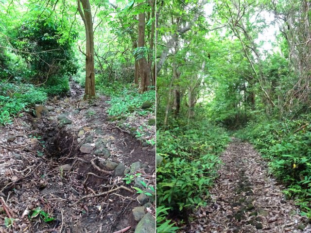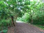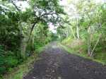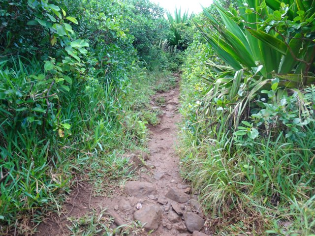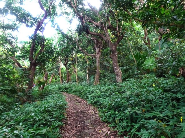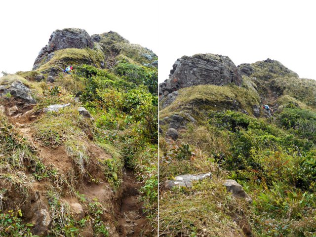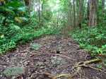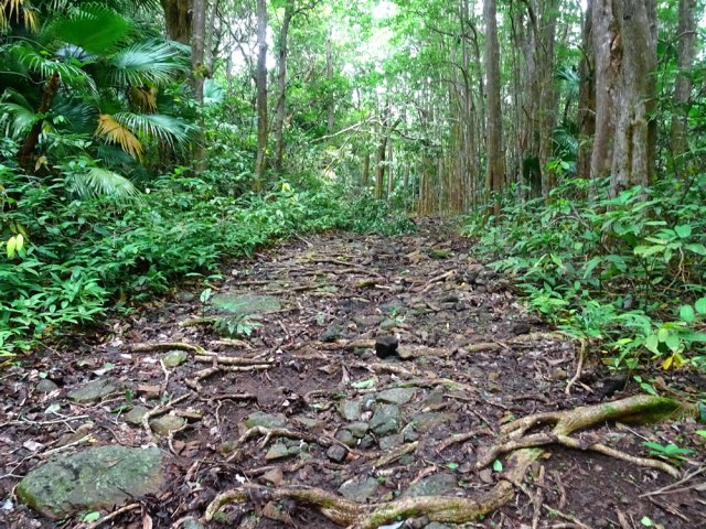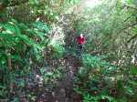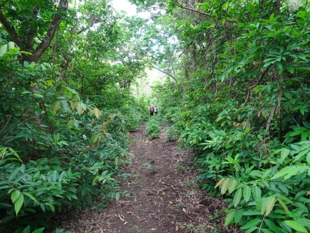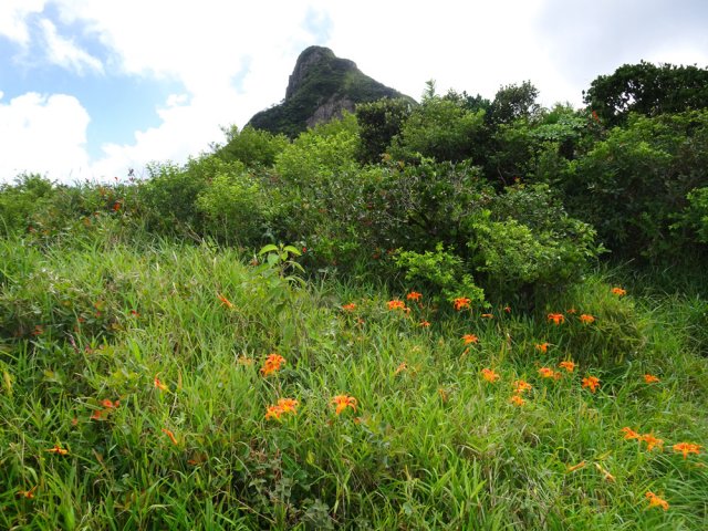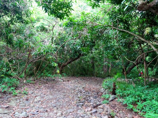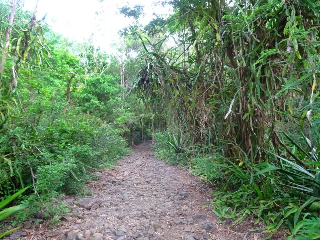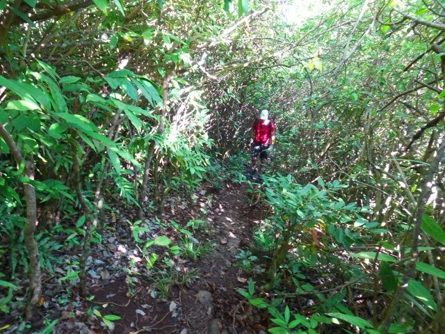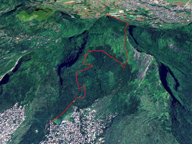 La randonnée débute à un parking d'une dizaine d'emplacements, avant la chaîne barrant le passage vers la route. Un panneau schématise les circuits possibles avec quelques explications. Sur le côté, quelques modules sont utilisés par les sportifs en début ou fin d'entraînement. Franchir la chaîne et entamer la légère montée sur route en frôlant un petit temple (Photo 1). La route permet de s'échauffer sur une légère pente bordée de plus en plus d'arbres et de rambardes en bois (Photo 2). 700 m plus haut, le goudron cesse, remplacé par une large piste caillouteuse (Photo 3). Le chemin se sépare en deux à un eucalyptus pour effectuer la petite boucle de Dauguet. On ne quitte pas la piste toujours aussi caillouteuse (Photo 4). Elle est large, facile en pente faible (Photo 5). Elle traverse une zone où les arbres sont couverts de cactées qui vont jusqu'à briser les branches (Photo 6). Le parcours oblique à gauche avant de reprendre la même direction. Le bord de la piste comporte de plus en plus de manguiers (Photo 7). On rencontre, sur la gauche, un temple sommaire à l'abri de grands arbres (Photo 8). Les singes s'y rendent pour tenter de voler les nombreuses offrandes sous forme de nourriture. En marchant silencieusement on peut les regarder jouer dans les parages. Poursuivre par la piste qui se rétrécit un peu sous de nouveaux manguiers (Photo 9). On frôle un figuier caractéristique et un kiosque qui domine le parcours. La piste se poursuit plein sud en direction du Pouce. Passer ensuite une clairière offrant de beaux points de vue sur Snail Rock (Photo 10) . Poursuivre sur la piste de plus en plus envahie de lianes papillon mais régulièrement entretenue (Photo 11). Plus loin, elle est défoncée par endroits et il faut monter en évitant les ornières glissantes (Photo 12). On rencontre des zones pavées encore bien conservées ou des vestiges de travaux (Photo 13). Le large sentier qui a effectué une boucle vers l'ouest rencontre un panneau indiquant les distances des principales destinations de la zone. Prendre à gauche à ce panneau et entamer la montée au Pouce. Les sous-bois très touffus envahis de lianes papillon assombrissent fortement le parcours (Photo 14). La marche s'effectue sur des lits de feuilles mortes en évitant les pierres et roches qui encombrent le sentier ou quelques parties un peu boueuses (Photo 15). La montée est régulière entre de hautes haies de lianes et des bosquets de goyaviers (Photo 16). Une demi-heure après la bifurcation, le chemin s'éclaire en arrivant aux premières clairières. On aperçoit enfin l'horizon et les pitons entourant Port Louis (Photo 17). Le sentier oblique sur la droite. Le sol est désormais recouvert de longoses à perte de vue (Photo 18). On ne les quittera guère jusqu'au sommet. Le terrain étant plus plat, le sentier est souvent très humide (Photo 19). Profiter des points de vue, même s'ils seront plus vastes une fois au sommet (Photo 20). On voit Pailles et la Pointe aux Sables ainsi que toute les zones urbaines périphériques de Port Louis (Photo 21). La suite de la montée est facile dans une végétation avec des palmiers qui se multiplient et des califons qui bordent le sentier humide. Le sentier, facile à suivre, traverse de grandes étendues herbeuses (Photo 22). On a gagné en altitude donc en panoramas sur les montagnes et villes du centre. On s'approche très vite du sentier le plus utilisé depuis Moka. Le Pouce est désormais bien visible au-dessus des longoses ou, par endroits, des lys orange. (Photo 23). Fini l'étroit sentier, humide et caillouteux. On entame cette dernière montée sur un large parcours usé par les dizaines de marcheurs quotidiens. Par beau temps, profiter des vues dégagées sur une grande partie de l'île. La montée s'intensifie légèrement. De nouveaux sentiers parallèles ont été créés par les passages fréquents. La profondeur de la terre creusée témoigne de l'intérêt que portent les randonneurs à ce sommet qu'on ne quitte plus des yeux (Photo 25). Après un dernier regard sur la plaine de Moka, entamer la partie la plus difficile (Photo 26). Très vite, on parvient à de véritables murs, parfois glissants (Photo 27). Il faut s'aider des mains pour les franchir. La fin de l'ascension est tout aussi éprouvante, surtout pour les randonneurs occasionnels (Photo 28). Du sommet, on peut à loisir observer les points caractéristiques de l'Île Maurice, même si aucune table d'orientation n'y est installée. Le sommet est encombré de roches mais assez plat pour ne courir aucun risque. Entreprendre la descente par le même sentier en prenant garde aux parties verticales et humides. Si un véhicule a été prévu à Moka, il est possible d'y redescendre une fois atteint le croisement. Sinon, reprendre l'itinéraire emprunté à l'aller et regagner le quartier de Tranquebar.