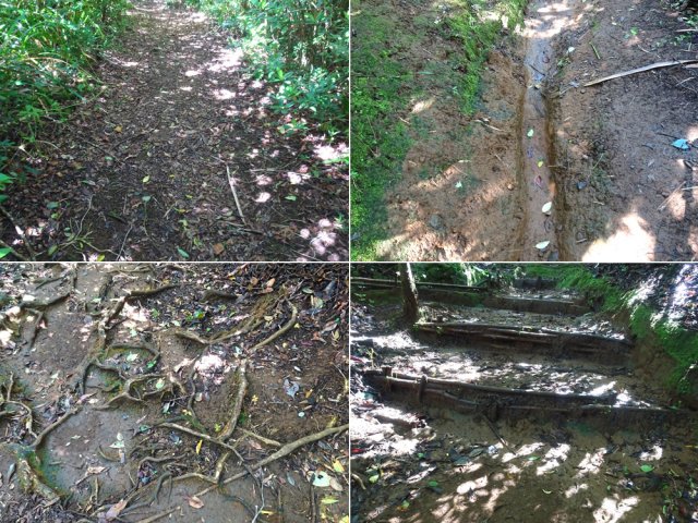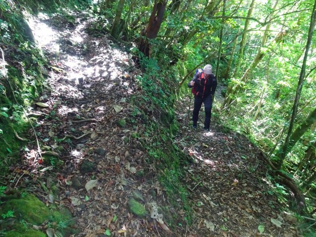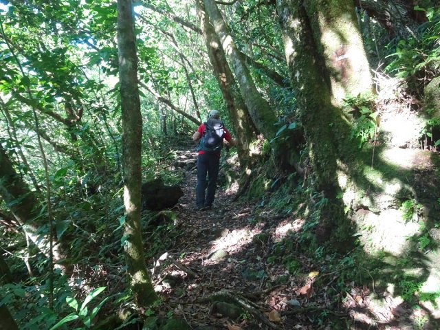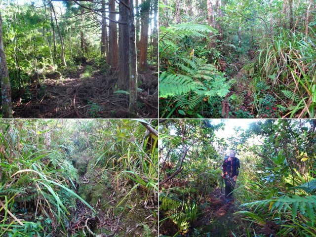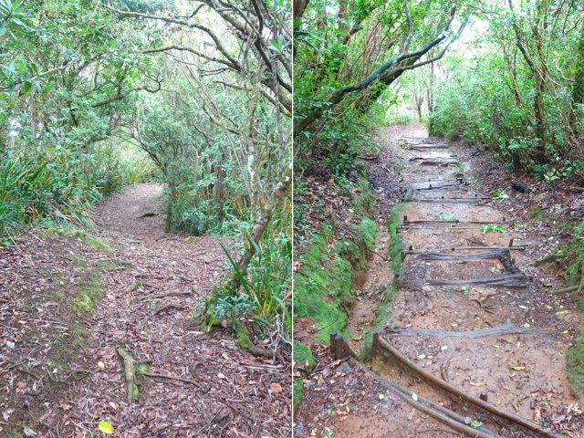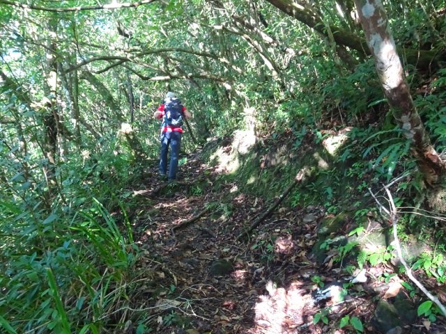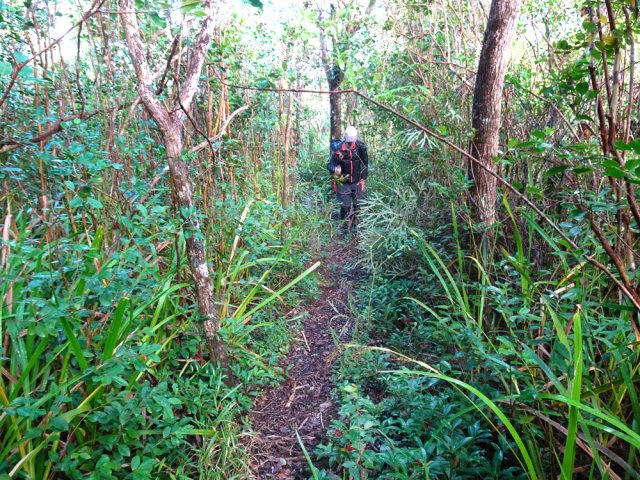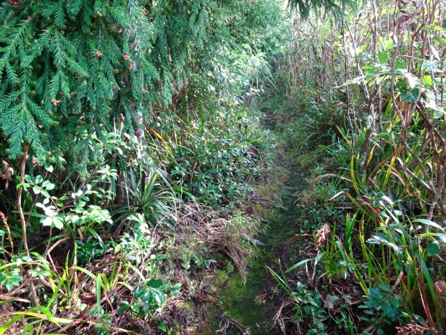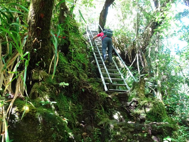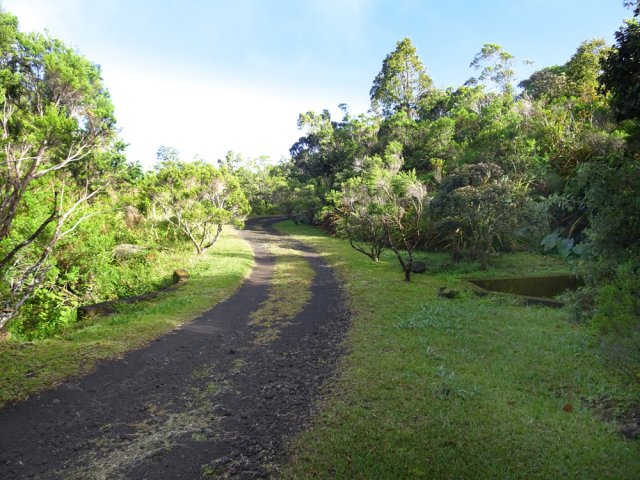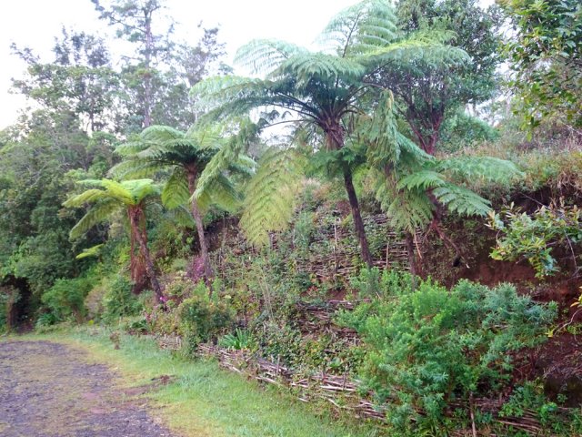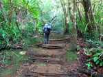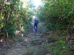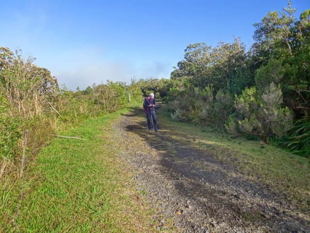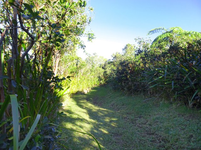 La randonnée débute au parking situé avant l'arrivée au gîte de Basse Vallée. Rejoindre le gîte et poursuivre sur le sentier partant en direction de la Ravine de Basse Vallée. On pénètre dans une magnifique forêt de cryptomerias moussus. Le sentier serpente entre les troncs et quelques roches au sol qui peut s'avérer glissant (Photo 1). On arrive ensuite à une barre rocheuse qui se franchit facilement par une longue échelle (Photo 2). On parvient très vite à la ravine au fond très rocheux qui se traverse longuement en partant tout d'abord vers l'aval avant de remonter un peu pour rechercher le sentier (Photo 3). La montée de près de 150 m débute à l'ombre (Photo 4). Elle est bordée par de beaux arbres penchés au-dessus de la forte pente du rempart (Photo 5). La pente du sentier n'est jamais forte en raison des lacets et la montée peut s'effectuer à un bon rythme (Photo 6). Les lacets se suivent aisément après de longues traversées de la forêt (Photo 7). Le sentier rencontre ensuite celui venant de Foc-Foc en direction de Jacques Payet. Aller à droite à partir du poteau du Parc National. La montée se poursuit mais change totalement de physionomie. Ce sentier est plus large, plus droit et constitué de marches en bois de goyavier (Photo 8). La montée rectiligne se poursuit sur des kilomètres en direction du volcan. Avant de rencontrer la piste forestière, un petit sentier de quelques mètres amène au bord du rempart. La végétation cache le paysage vers le nord mais la Vallée Heureuse et la côte sont bien visibles (Photo 9). Bifurquer à gauche, puis entamer une portion reposante sur la longue Piste Forestière des Onze Cents qui débute par de belles portions herbeuses (Photo 10). Un peu plus loin, après de grandes étendues de pailles sabres, il se rétrécit un moment (Photo 11). Après une clairière assez large, on arrive à la piste qui est un pur plaisir entre goyaviers et bois de couleurs (Photo 12). Ces trois km en pente très légère permettent de reposer les jambes avant d'entamer la deuxième partie de la montée (Photo 13). Après le franchissement de 13 ravines plus ou moins larges avec des vues fréquentes sur la côte, on parvient à une aire aménagée en rive gauche de la Ravine Souris Chaude (Photo 14). S'approcher du radier bétonné qui domine quelques bassins à sec et entamer la montée du sentier bordé de barrières de goyaviers tressés (Photo 15). Quelques mètres plus haut, le bois constitue une agréable aire de repos, voire de bivouac, entourée de la belle forêt (Photo 16). C'est parti pour près de 400 m d'ascension sur un sentier très agréable et assez large pour ne pas être mouillé par la rosée du matin (Photo 17). Les amateurs de nature se régaleront tout au long de la montée avec toutes les plantes variées rencontrées (Photo 18). Du début à la fin, il n'y aura jamais de question à se poser sur la direction. Même quand les fougères et les sabres ont pris possession des abords, le sentier est facile à deviner (Photo 19). Ces petites difficultés ne dépassent pas les 100 m. On retrouve très vite le sentier qui se rapproche souvent des longues rangées de cryptomerias (Photo 20). Hormis une ravine à traverser, la pente ne comporte guère d'écueils (Photo 21). Les seuls inconvénients sont les petites branches de cryptomerias tombées au sol, les sabres ou les fougères et quelques ornières (Photo 22). On frôle également des bois de camphriers qui ont perdu beaucoup de branches lors du Cyclone Garance (Photo 23). Après une heure de montée constante, on débouche sur le large sentier venant du Piton Lardé, à quelques mètres seulement de l'abri de l'ONF (Photo 24). Poursuivre en partant sur la droite. Frôler l'abri et traverser une n-ième forêt de cryptomerias avant de descendre constamment vers Basse Vallée. La forêt de chaque côté empêche tout point de vue (Photo 25). On rencontrera tous les types de sol avec la boue, les passages étroits et glissants, les racines ou les centaines de marches en bois de goyavier (Photo 26). A l'approche de la RF des Onze Cents, un nouveau panorama est possible sur la Vallée Heureuse, vers le nord cette fois (Photo 27). La fin de la descente est une suite ininterrompue de marches et de quelques parties plus plates (Photo 28). Au croisement rencontré le matin en bordure de parc, bifurquer à gauche et reprendre en sens inverse les 15 lacets jusqu'à la Ravine de Basse Vallée. Après le franchissement, on retrouve l'échelle et le sous-bois moussu avant de rejoindre le parking.