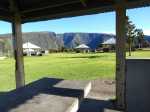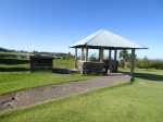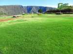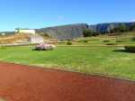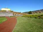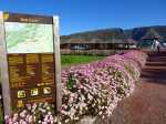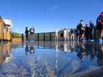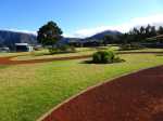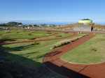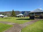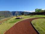 La "randonnée" débute sur un grand parking très bien aménagé à l'entrée du complexe touristique. De très nombreux emplacements sont réservés à l'entrée de l'aire (Photo 1). Rejoindre la première allée constituée de terre battue, bordée de belles pelouses bien tondues (Photo 2). Il est conseillé de visiter le lieu avant le passage d'un cyclone qui mettra à mal ce revêtement comme on l'a vu pour le circuit de Grande Anse . Récemment planté, l'espace ne cache jamais l'horizon (Photo 3). Suivre les allées qui vont et viennent par d'agréables lacets arrondis (Photo 4). Ne pas emprunter la courte pente en arrivant au château d'eau car elle finit en lisière, obligeant à faire demi-tour. Rejoindre alors le réservoir en filant tout droit vers l'allée principale (Photo 5). Cette large allée, un peu plus caillouteuse, n'empêche pas le passage des roues. L'endroit est très fleuri (Photo 6). Garder la visite des kiosques des commerçants en fonction de l'heure ou après la visite. Rejoindre l'horloge à eau. Hors des heures ouvrables, le local est fermé (Photo 7). Lorsque le belvédère s'ouvre aux visiteurs, l'horloge est alors visible (Photo 8). Il est intéressant de s'approcher du mécanisme hydraulique enfermé dans sa cage en verre pour tenter de deviner l'heure. La précédente clepsydre comportait des tuyaux de tous côtés. Celle-ci est principalement constituée de globes en verre reliés entre eux où s'écoule une eau bleue mélangée à de l'alcool (Photo 9). Une fois l'heure décryptée, se rapprocher du belvédère, gardé et surveillé, contrairement au précédent qui était libre d'accès. Le spectacle est au rendez-vous. Si les vitres peuvent impressionner, c'est surtout le paysage entourant Grand Bassin qui a le plus de succès (Photo 10). Le vide sous l'édifice est peu impressionnant en raison des rochers tout proches. En revanche, Grand Bassin paraît vertigineusement loin (Photo 11). Par temps sec, on voit très bien le paysage sous les grandes vitres épaisses (Photo 12). Sous la pluie, le spectacle doit rester banal. Le temps n'est pas compté ; on peut rester autant que l'on désire. En se penchant au-dessus de la rambarde, on voit tout aussi bien le village tel qu'on l'apercevait avec l'ancien belvédère (Photo 13). La vallée du Bras des Roches Noires et toujours aussi impressionnante (Photo 14). Une fois la visite terminée, se diriger vers les commerçants s'ils sont présents. C'est surtout en fin de semaine que l'affluence est la plus importante. L'allée bétonnée est de plus en plus recouverte de scories mais elle est certainement balayée régulièrement. (Photo 15). Si un cari est prévu à l'ombre d'un kiosque, obliquer à droite à la première petite allée. Elle mène tout d'abord aux toilettes publiques (Photo 16). Si tous les kiosques sont entourés de pelouse, deux ont été laissés aux fauteuils roulants (Photo 17). Ils sont larges et peuvent accueillir une famille complète proche d'un barbecue (Photo 18). Les paysages alentour donnent vraiment envie d'y rester le temps d'un cari (Photo 19). Le repas terminé, revenir aux commerces séparés par une large allée bétonnée (Photo 20). Partir sur la droite pour emprunter une nouvelle allée sinueuse dans le même type de paysage qu'en venant (Photo 21). Il sera fréquent, durant cette traversée, de croiser des randonneurs qui filent tout droit au départ du sentier de Grand Bassin (Photo 22). Se retourner une dernière fois pour admirer les coteaux dominant Grand Bassin (Photo 23) puis les pelouses bien entretenues (Photo 24) avant de regagner le parking tout proche.