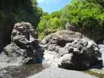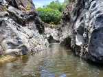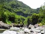 Tous les randonneurs n'apprécient pas forcément de marcher plusieurs heures dans des fonds de ravines. Il faut se mouiller les pieds, les glissades sont fréquentes, les galets roulent sous le pied ou des pierres peuvent dégringoler des falaises souvent abruptes des canyons. Les amateurs de l'exercice apprécieront cette nouvelle sortie aquatique, courte mais sportive en raison de certains passages délicats ne nécessitant cependant pas de matériel. Le départ s'effectue en aval du barrage des Fleurs Jaunes à Bois de Pommes. Il est possible de poursuivre jusqu'à la mer ou au village de la Rivière du Mât si on est peu nombreux et qu'on dispose d'une longue journée. La partie du pont de l'Escalier a déjà été présentée sur une randonnée les pieds dans l'eau dans des paysages moins attrayants que ceux proposés sur cette fiche. La Rivière des Fleurs Jaunes est un joli torrent parfois fougueux se faufilant dans de superbes canyons étroits. Celle du Mât propose de magnifiques paysages même si la vallée peut être plus large par moments. Le seul point noir se situe au départ. Un sentier encore bien marqué sur la carte relie le sentier de l'Îlet Fleurs Jaunes au barrage mais il a beaucoup souffert des cyclones et poussées de végétation. Il est donc réservé aux randonneurs aguerris habitués aux hors sentiers. Nous l'avons pourtant emprunté mais il est aussi possible de braver quelques interdits et d'utiliser la petite route, comme le font les pêcheurs. Toute la sortie peut s'effectuer sans nager mais difficile d'y échapper si la chaleur incite au rafraîchissement.