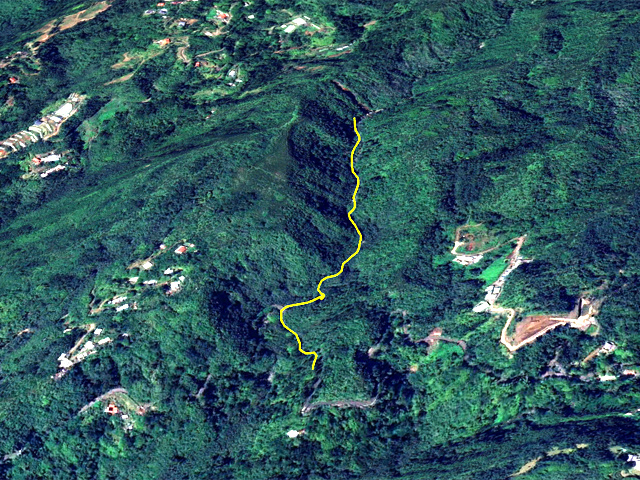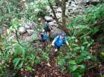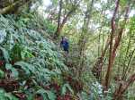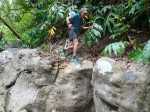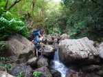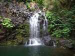 La randonnée débute sur la RD43 au plus près de la Ravine du Butor. Rejoindre le pont en profitant d'un point de vue sur Saint-Denis et la vallée de la ravine (Photo 1). La circulation n'est pas très importante et la distance très courte (Photo 2). Au pont, partir sur la droite en longeant le grillage qui entoure la citerne de 40 m3 destinée à récupèrer l'eau au sommet de la première cascade (Photo 3). Marcher un peu en rive gauche et traverser une première fois la ravine sur un gué sommaire comportant un long câble de maintien (Photo 4). On peut remonter la rivière jusqu'au pied de la première cascade. Sinon, trouver sur la gauche un sentier étroit qui attaque le rempart pour contourner la falaise (Photo 5). La pente est forte mais les nouveaux câbles facilitent la montée (Photo 6). Les longoses et les jouvences ont presque tout envahi. Une fois au point haut, le sentier entame sa descente en longeant le rempart très pentu et assez dangereux malgré la présence de nombreux arbres. On distingue la cascade à travers les futaies (Photo 7). La dernière descente est assez glissante sur les pierres luisantes mais les rambardes aident au maintien. La pente se termine à une petite passerelle qui doit être infranchissable lors des crues (Photo 8). Le torrent se précipite dans le vide. On peut voir le bassin depuis les rochers mais gare à la glissade. Pour plus de sécurité, oser descendre l'échelle fixée à la paroi et gagner une petite plateforme destinée à la maintenance des tuyauteries. On peut ainsi profiter de belles vues sur la chute en toute sécurité contre la barrière (Photo 9). Le système de récupération des eaux est simple. Quelques vestiges de la construction demeurent dans les longoses (Photo 10). Après cette première chute, entamer la remontée de la ravine en longeant tout d'abord un premier bassin (Photo 11). La marche s'effectue comme toujours en cherchant le meilleur passage entre ou sur les galets. On parvient assez rapidement à la deuxième cascade que l'on aperçoit de loin (Photo 12). La chute est agréable. Elle provient de deux bras de la ravine et remplit un beau bassin assez profond pour se baigner (Photo 13). Pour remonter vers le troisième bassin, il faut trouver l'étroit sentier qui remonte le rempart en rive gauche. Revenir sur ses pas et chercher le départ assez instinctif dans une cassure de la barre rocheuse envahie de racines, longoses et fougères (Photo 14). Pas de difficulté pour deviner la trace mais de gros efforts pour monter avec les mains cherchant branches et racines (Photo 15). Un gros fil électrique facilite grandement l'ascension (Photo 16). A la hauteur de la cascade, le sentier s'assagit mais reste toujours aussi étroit (Photo 17). On parvient sur la rive après une courte descente au milieu des longoses (Photo 18). On retrouve les deux embranchements repérés depuis le bas (Photo 19). La dernière cascade de la matinée se rejoint facilement en longeant des petits toboggans sur de larges plaques de basalte (Photo 20). La marche est donc rapide une grande partie du temps (Photo 21). On trouve bien évidemment les gros galets classiques des fonds de ravines (Photo 22). Le torrent est agréable, de minuscules chutes agrémentent la marche de leur musique aquatique (Photo 23). Les passages techniques sont rares et demandent peu d'efforts (Photo 24). On parvient assez vite au troisième bassin, aussi grand que les autres. Une petite chute l'alimente (Photo 25). Les falaises tout autour du bassin sont quasi verticales et il faut renoncer, à moins de trouver une trace de pêcheur, vraisemblablement en rive gauche. Faire demi-tour et reprendre le chemin inverse en faisant attention aux glissades (Photo 26). Après avoir utilisé le câble électrique et ses nœuds, on peut revenir à la ravine ou suivre un autre sentier en rive gauche et rejoindre le cours d'eau une cinquantaine de mètres plus loin. Franchir plus bas la passerelle puis longer les câbles avant de retrouver la citerne et la RD34.