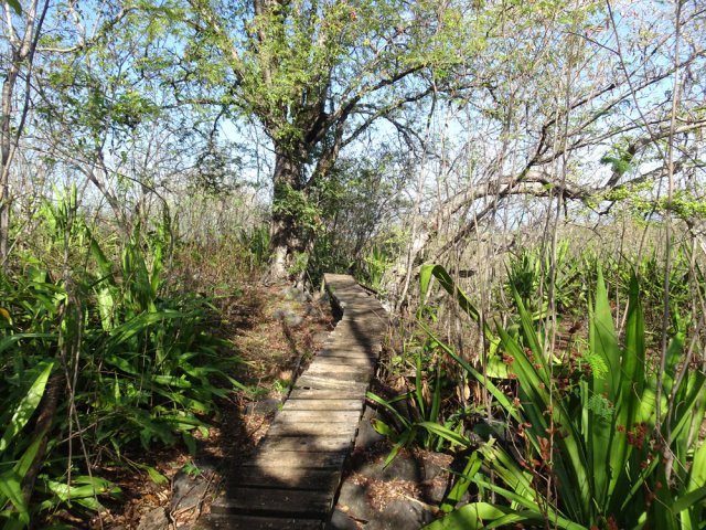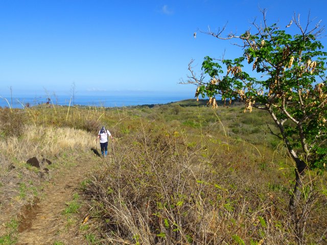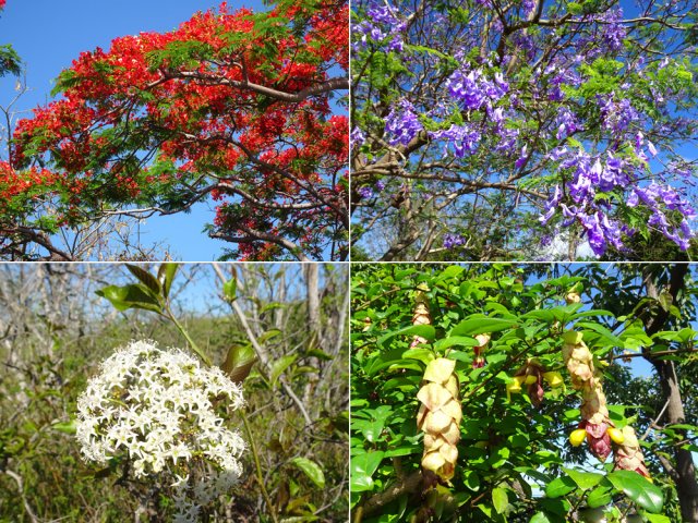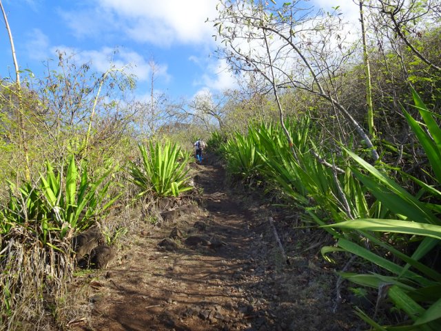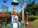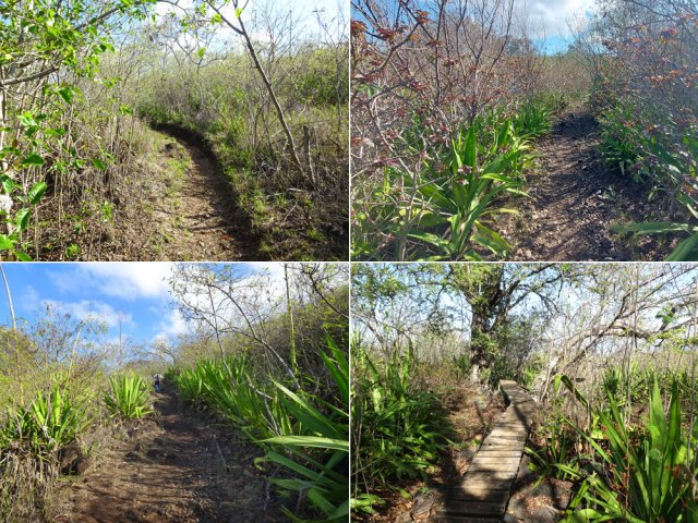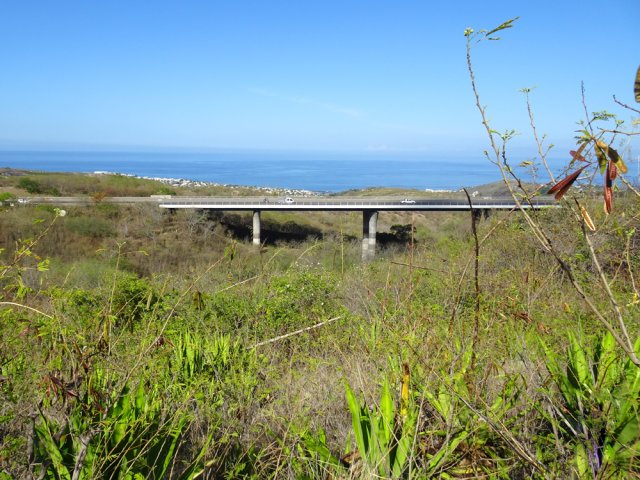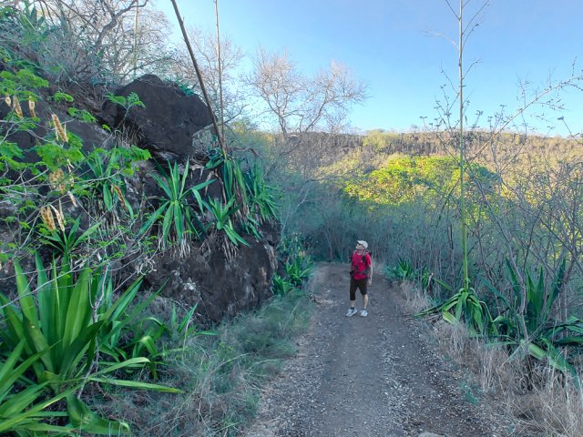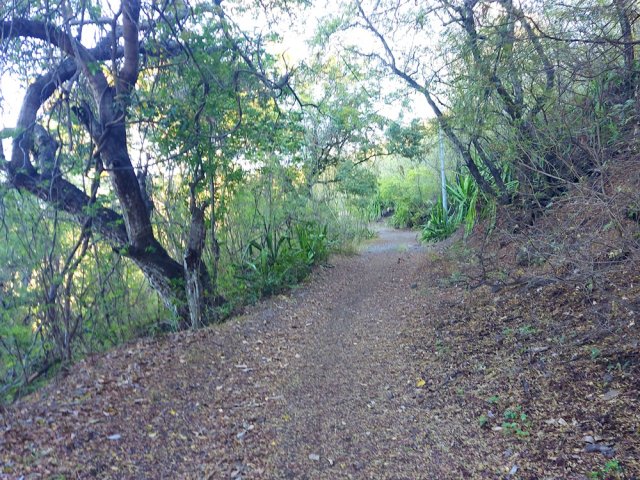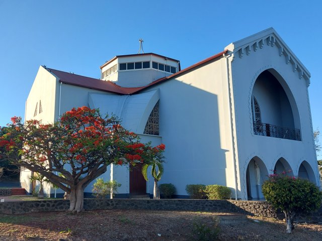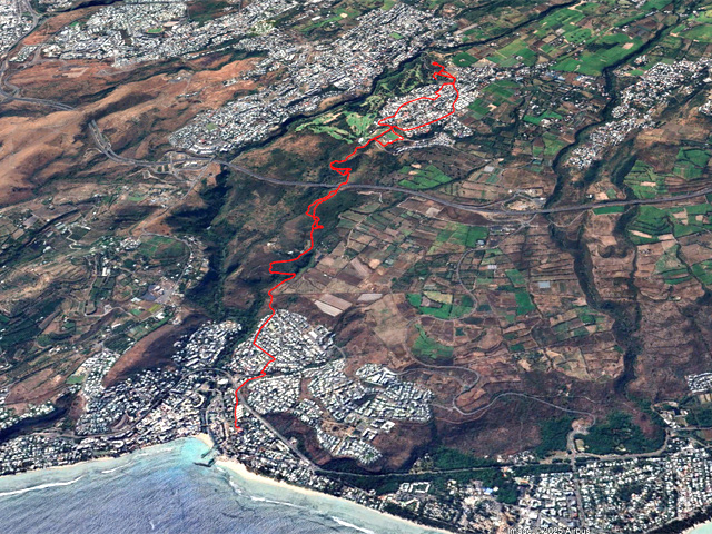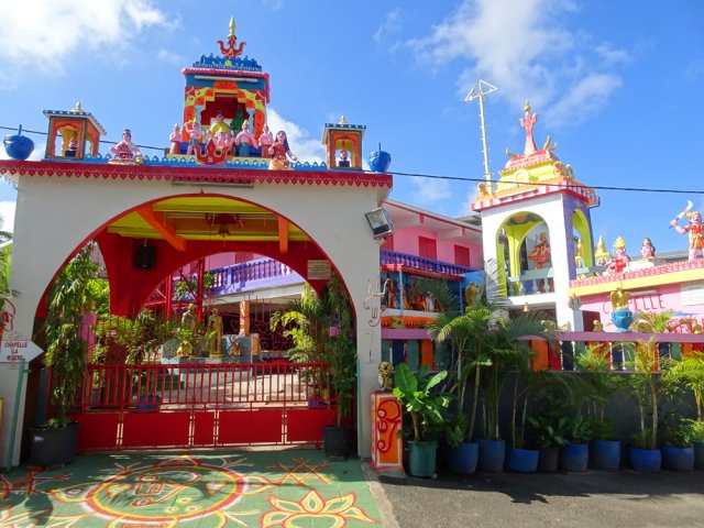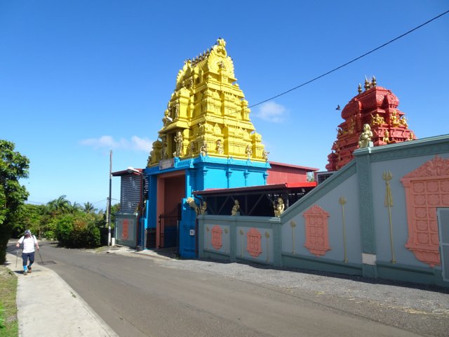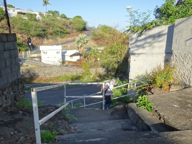 La randonnée débute au port de Saint-Gilles. Les emplacements sont difficiles à trouver dans la journée. Quelques places ombragées entourent l'église Notre Dame de la Paix isolée sur sa petite colline (Photo 1). Emprunter la Rue Maunier en longeant des barres d'habitation. Poursuivre par le Chemin Carrosse en passant sous la RN1A. Franchir une minuscule ravine proche d'un oratoire rouge et ne pas manquer l'escalier débutant à droite pour traverser un lotissement, sans emprunter les rues habituelles (Photo 2). Continuer sur la Rue des Vivaneaux puis à nouveau sur le Chemin Carrosse avant de prendre le chemin partant à gauche. Il comporte une grille ouverte avec des panneaux d'interdiction de circuler mais aucune interdiction de passer à pied. Entamer la remontée de cette piste anciennement utilisée pour les cultures. Les champs ont disparu depuis longtemps, remplacés par des hectares de chocas et épineux. On a heureusement de belles vues sur l'océan, Saint-Gilles ou la colline abritant le Théâtre de Plein Air (Photo 3). La savane comporte quand même quelques arbres, principalement des tamarins ou des faux poivriers, procurant peu d'ombre (Photo 4). Dans le premier lacet, on coupe une ravine à sec, envahie de taros, surgissant d'un étroit canyon (Photo 5). Un peu plus haut, le chemin longe une barre rocheuse occupée par les chocas (Photo 6). Il est possible de poursuivre la montée calmement en franchissant un nouveau lacet ou trouver, sur la droite, le sentier de raccourci qui monte assez fortement mais permet d'économiser 300 m de piste. Les prochaines pistes sont privées et souvent fermées de barrières ou portails. On rencontre un peu plus loin un nouveau chemin qui part sur la gauche. Il est très caillouteux sur 200 m puis plus terreux au fur et à mesure de la montée (Photo 7). Marcher ainsi jusqu'à la station de pompage installée le long du Canal Bruniquel qu'on devine par endroits. La ruine tient encore debout, peu rouillée, car la région est sèche (Photo 8). Plusieurs sentiers passent au plus près de l'ouvrage. Prendre le plus évident et continuer la montée vers Villèle dans un terrain surtout recouvert d'épineux et de chocas (Photo 9). Parcouru par les VTT, le sol est toujours propre même si l'on rencontre ça et là de grosses roches plus dangereuses pour les cyclistes que pour les marcheurs (Photo 10). Le hors sentier est presque impossible en raison de la présence d'épineux bordant le sentier (Photo 11). Cette première montée se termine à une piste. Partir à gauche et marcher jusqu'au pont qui enjambe une petite vallée (Photo 12). Encore 200 m de piste et poursuivre la montée en empruntant le premier sentier à droite. Le paysage change peu. La végétation n'empêche pas les points de vue sur la mer et les villes de la côte (Photo 13). Toute la zone entre la RN1 et Villèle est parcourue de sentiers autant empruntés par les marcheurs que par les cyclistes (Photo 14). Ces derniers on fabriqué un peu partout des tremplins parfois acrobatiques (Photo 15). La montée prend fin dans les herbes jaunes près du grillage entourant les terrains du Golf de Bourbon (Photo 16). On peut filer directement vers le terrain de sport ou visiter l'entrée de l'établissement pour se donner envie de frapper la balle à l'occasion (Photo 17). Emprunter la route de sortie longeant quelques greens (Photo 18). Un portail électrique est le plus souvent fermé mais un passage pour piétons permet de sortir de l'enclos sans problème. Prendre la première rue à gauche et entamer une balade dans le village de Villèle. Les rues sont paisibles et la progression s'effectue sans danger (Photo 19). Remonter une partie de la Rue Mahatma Gandhi pour aller à la rencontre de la Chapelle la Misère. L'établissement tamoul, fermé par un portail, est haut en couleurs (Photo 20). Continuer dans la même direction et bifurquer sur le Chemin des Violettes pour se rapprocher d'un autre temple, plus grand mais plus classique dans sa forme (Photo 21). Une fois les effigies repeintes de toutes les couleurs, le détour vaudra vraiment la peine. Contourner le temple et revenir sur la Rue Gandhi. On se rapproche alors de la grande propriété du Domaine de Villèle. Repérer, sur la droite, une statue de Gandhi. Ce grand leader politique indien n'est pas seul : on retrouve à ses pieds les divinités rencontrées ailleurs sur l'île (Photo 23). En partant à 7 heures de Saint-Gilles, on parvient au musée pour l'ouverture des portes. Longer l'allée menant au musée qu'on rencontre assez rapidement sur la gauche (Photo 25). Ce haut lieu du tourisme accueille toute l'année de nombreux visiteurs. En descendant vers le bâtiment, on rencontre une statue de Madame Desbassayns, sculpture en basalte de Marco Ah-Kiem (Photo 26). Après la visite, ou avant l'ouverture, continuer vers la RD6 en traversant un parc. De l'autre côté de la route, suivre une des allées menant à la Chapelle Pointue. Elle est bordée de quelques oratoires fleuris (Photo 27). La chapelle, tout près, mérite une halte pour en étudier l'architecture (Photo 28). Si elle est ouverte, le plafond mérite cinq minutes pour admirer le travail de menuiserie ou rendre une visite au tombeau de l'ancienne maîtresse des lieux. On est tout près d'un arrêt de bus pour les marcheurs fatigués qui désirent s'arrêter. Le retour, tout en descente, demande beaucoup moins d'efforts. Il est possible de reprendre le trajet de la montée ou, avec la carte en main, emprunter d'autres rues et sentiers pas encore reconnus.
