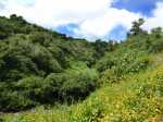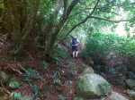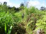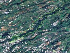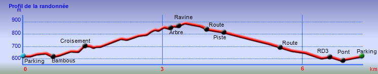 La randonnée débute le long de la RD3 depuis les emplacements de stationnement de la mairie annexe. Emprunter la ruelle frôlant l'école Charles Cros et passer entre les stades. Le Piton Nathalie est très proche alors que le Piton des Neiges semble minuscule (Photo 1). Récupérer plus haut la Rue Bédier qui amène au Domaine Vidot dans un bel écrin de verdure (Photo 2). Partir en direction des grosses touffes de bambous puis obliquer à gauche vers le départ discret du sentier longeant la Ravine des Cafres (Photo 3). Il passe tout d'abord dans les herbes avant de pénétrer dans le sous-bois qu'on ne quittera plus jusqu'au premier village (Photo 4). C'est parti pour plus de 2h sur un large sentier bien entretenu (Photo 5). La pente du rempart, très boisée, est souvent forte vers la petite rivière à sec. La zone est assez rocheuse et c'est souvent que l'on marche près de longues falaises jamais très hautes (Photo 6). Il faut parfois traverser de modestes ravines caillouteuses envahies de longoses qui ne ralentissent pas la marche (Photo 7). La progression s'effectue donc en dents de scie pour franchir ravines ou reliefs. Certaines pentes sont plus abruptes et comportent des lacets (Photo 8). D'autres grimpent tout autant mais de façon rectiligne. Les trouées dans la végétation sont assez rares. Elles permettent de temps en temps d'apercevoir les principaux sommets de l'île (Photo 9) ou le fond de la Ravine des Cafres à quelques mètres en contrebas (Photo 13). Les barres rocheuses ne disparaissent jamais totalement (Photo 11). Aucune difficulté pour s'orienter sur le large sentier bordé de nombreux faux poivriers et goyaviers (Photo 12). A mi-parcours, une zone envahie de hautes cannes fourragères a tendance à boucher un peu la vue mais sur une vingtaine de mètres seulement (Photo 14). Tout le reste de la montée est du même acabit entre quelques parties plates, très pentues, dans les bois ou le long des rochers. A noter le passage près d'une grosse touffe de passiflore sauvage (Passiflora alata) aux magnifiques fleurs de près de 10 cm de diamètre (Photo 15). A la saison, on rencontre également une variété plus petite laissant sur le sentier des dizaines de fruits délicieux. Deux ravines demandent un peu d'attention et quelques efforts pour les franchir (Photo 16). Le sentier se poursuit ainsi jusqu'au bord de la Rivière des Remparts si l'on dispose de plusieurs heures et de beaucoup de courage pour des dizaines de nouvelles courtes ascensions. Dans un virage à droite, repérer le jamrosat au tronc caractéristique, le sentier remontant à la Ligne d’Équerre débute juste en-dessous (Photo 17). Il traverse immédiatement la ravine des Cafres sur de gros galets. Légèrement sur la gauche, on devine la suite qui remonte en pente douce sous les grands arbres (Photo 18). Plus haut, il traverse un affluent de la Ravine des Cafres. Chercher vers l'amont la suite du sentier (Photo 19). Elle est facile à trouver sous les grands jamrosats (Photo 20). La pente s'intensifie, la trace se rétrécit, la terre devient glissante et quelques marches ont été creusées. Plus haut, on retrouve les cannes fourragères, les fougères et les jouvences mais sans perdre le sentier de vue (Photo 21). La courte ascension se finit à une piste qui remonte dans les champs. Partir à gauche sur une courte distance en longeant des clôtures (Photo 22). Passer quelques cases puis poursuivre à travers champs sur une route calme et étroite (Photo 23). Les habitations clairsemées se rejoignent sans effort par une pente très faible (Photo 24). A la fin du hameau de la Ligne d’Équerre, bifurquer à droite pour atteindre une piste fréquentée par les engins agricoles. Elle évite la circulation déjà très faible et permet une descente bucolique entre champs, friches et plantations d'ananas (Photo 25). Sans forêt pour masquer le regard, on a souvent les villes du littoral en point de mire ou le Piton Nathalie entouré d'habitations (Photo 26). Puisqu'il n'y a pas de sentier comme celui emprunté plus haut pour couper la ravine et remonter au Domaine Vidot, on est obligé de rejoindre la RD 3 pour moins d'un km. La route est beaucoup plus large et la circulation automobile bien plus importante. C'est donc en prenant garde qu'on effectue ce long lacet traversant la ravine que l'on vient de suivre. On la longe en aval du pont (Photo 27). L'accotement est très étroit mais la traversée ne dure que quelques minutes (Photo 28). Les premières maisons et la pharmacie de Mont Vert arrivent très vite et l'on retrouve le véhicule à l'ombre près de la mairie.