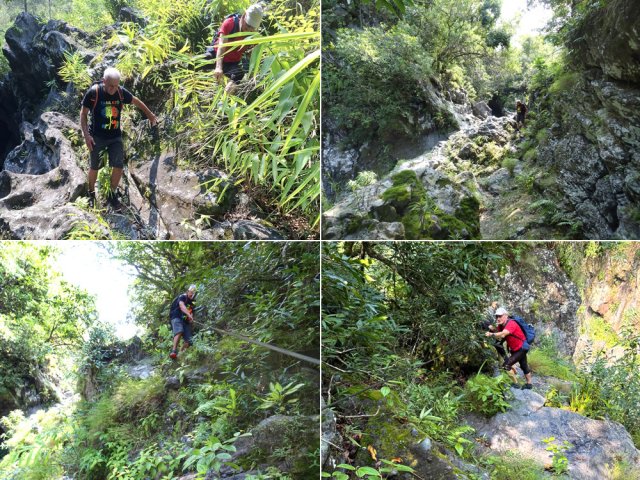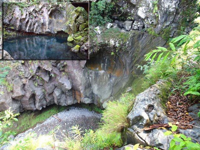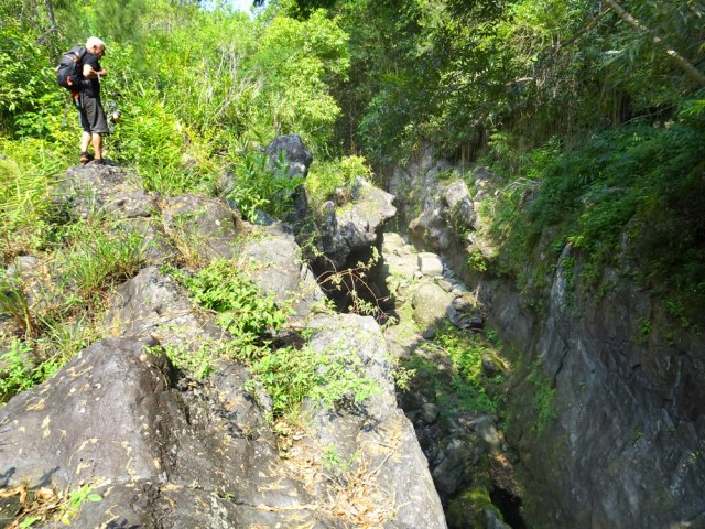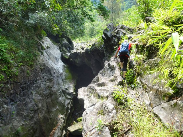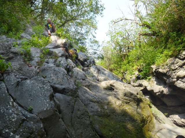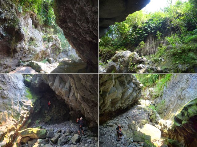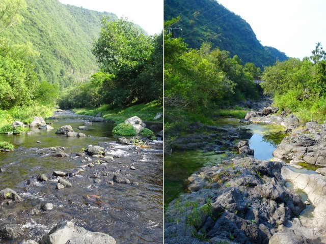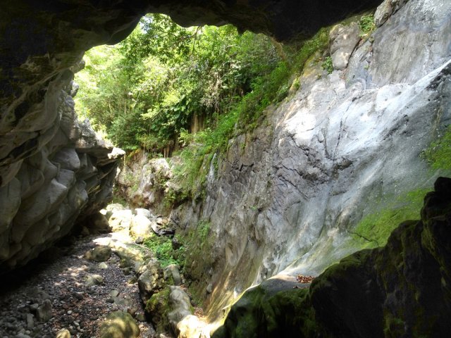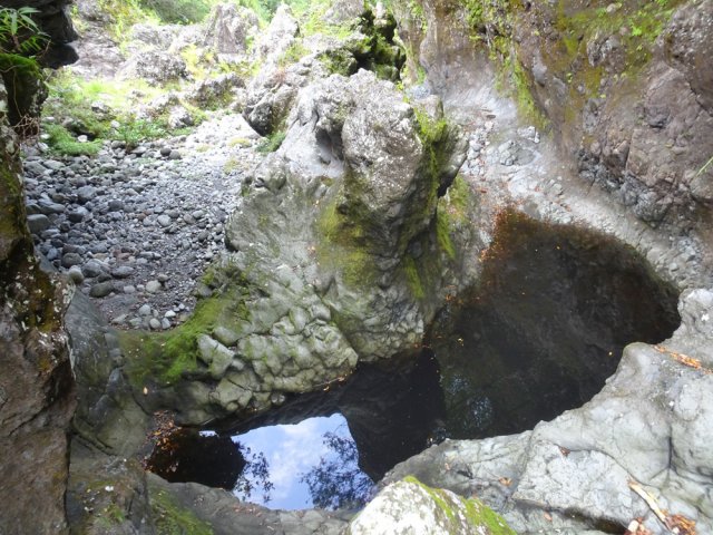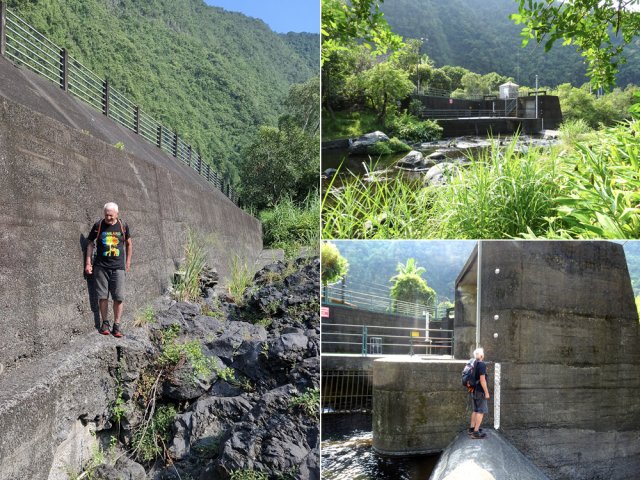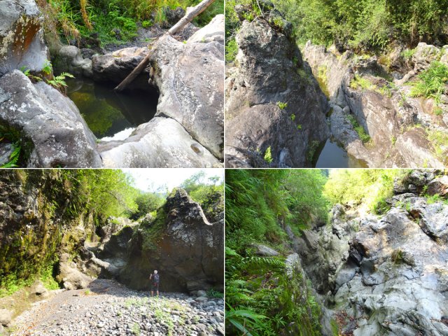 La randonnée débute ici sur l'ancienne route de Grand Galet, au plus près de la rivière. Se rapprocher de la rivière et marcher vers le barrage pour en étudier le fonctionnement. L'eau bifurque en rive gauche et se dirige vers le tunnel alimentant l'usine hydroélectrique. Repérer au passage le niveau de l'eau lors de certains cyclones dévastateurs (Photo 1). S'il y a beaucoup de débit, une partie de l'eau descend le lit qui, sinon devient sec car la priorité est donnée à l'usine. Depuis la digue, on peut voir immédiatement la différence (Photo 2). D'un côté l'eau limpide, de l'autre les flaques laissées par les pluies. C'est donc sur les éternels galets que débute cette randonnée. Le lit étant assez tourmenté, on y trouve des galets allant du ballon de rugby à la taille d'une voiture. Certains îlots rocheux n'ont pas encore pu être érodés (Photo 3). On croise des bassins sans fond, des roches, des cassés facilement franchissables (Photo 4). En grimpant le fossé en rive droite on arrive dans une longue faille à une dizaine de mètres de la rivière. On ne la voit pas en raison de la hauteur des murs moussus (Photo 5). La végétation des abords est principalement constituée de goyaviers et jamrosats créant des tunnels sombres (Photo 6). Les grottes, bouches de tunnel ou fissures ne sont pas en reste pour varier les paysages (Photo 7). Le premier grand bassin comporte des parties glissantes mais se contourne facilement. 100 m plus loin, on retrouve le fond rocheux. La marche est moins rapide que dans la faille mais il n'est pas toujours facile de traverser les fourrés et taillis (Photo 8). Un nouveau cassé précédé d'un étroit canyon se présente plus bas. C'est le grand bassin des Hirondelles. Avant de le traverser, remonter assez aisément les roches en rive gauche et marcher jusqu'aux cordes installées par les canyonistes pour effectuer une sortie quand il y a de l'eau. Attention à la descente glissante au retour (Photo 9). La descente du cassé commence par le canyon glissant où il est impératif de se tenir à la paroi (Photo 10). Une courte escalade en fin de canyon amène à un premier palier (Photo 11). Là aussi, la mousse impose de prendre son temps et de bien se maintenir à la roche (Photo 12). Il vaut mieux ne pas souffrir de vertige pour certains contournements (Photo 13). Ne pas chercher à descendre immédiatement au fond du bassin mais longer la falaise en rive gauche en passant près d'un magnifique affouche aux très longues racines. Une fois au fond on peut voir les hirondelles sortant de la grande grotte de l'autre côté (Photo 14). 5 minutes plus tard, on parvient à un nouveau cassé très facile à longer sans crainte (Photo 15). A nouveau, 5 minutes plus tard, on arrive au plus important bassin de la sortie, le Bassin à Jules. Impossible de descendre au fond immédiatement. Il faudra attendre d'être plus loin. Il est facile d'en suivre le haut sur les rochers assez stables (Photo 16). En restant toujours en rive gauche, on parvient là aussi aux câbles laissés par les professionnels pour descendre vers le Pont Babet (Photo 17). De cet endroit, on envie les sportifs qui finiront leur descente dans le Bassin à Jules, très profond, qu'il soit plein ou vide (Photo 18). Revenir sur ses pas de quelques mètres et trouver le long de la paroi des faiblesses permettant d'atteindre le fond du bassin qui domine celui à Jules. Une fois dans le canyon, on se régale du spectacle des parois, des interminables racines de Monstera délicieux, de la grotte du fond et du calme des lieux (Photo 19). Après une dernière photo depuis la grotte (Photo 20), revenir au point de faiblesse dominant le Bassin à Jules et remonter en rive gauche. Impossible de poursuivre sans cordes, aussi, reprendre le chemin inverse le long de la profonde faille (Photo 21). Remonter la rivière à sec et tenter de varier les paysages rencontrés lors de la descente. On retrouve les grosses roches bordées de jamrosats (Photo 22). On retrouve également des contournements sur les rives si l'on ne désire pas reprendre le fond de la rivière (Photo 23). Heureusement, pas de vigne marronne ou de galaberts qui pourraient abîmer les pieds (Photo 24) !! Les passages délicats délaissés dans la descente peuvent désormais se remonter plus sereinement en se méfiant tout de même de la mousse omniprésente (Photo 25). En délaissant la faille de contournement, on peut ainsi profiter de nouveaux paysages et de nouveaux canyons ou grottes. L'une d'entre elles est particulièrement profonde et dangereuse, imposant de retrouver les goyaviers pour un temps (Photo 26). C'est ainsi qu'on rencontre à nouveau le cassé présenté plus haut et évité par sécurité, car en descente. On peut ainsi repérer une ancienne arche, brisée par les éléments (Photo 27). Plus haut, un nouveau bassin doit se contourner (Photo 28) mais la petite route qui longe le réservoir de l'usine est proche et il est préférable de s'y rendre pour éviter de reprendre le lit de la rivière jusqu'au barrage. Il est facile de repérer des passages permettant de grimper le talus et se rapprocher de la haute grille. Prendre à gauche en direction de la Passerelle. Longer le long bassin, laisser l'école en ruine, puis traverser la passerelle sur la partie piéton avant d'emprunter l'ancienne route jusqu'au véhicule laissé en rive droite.