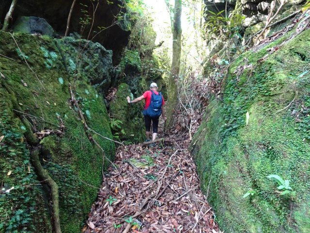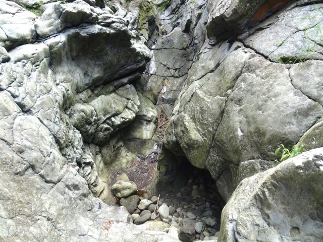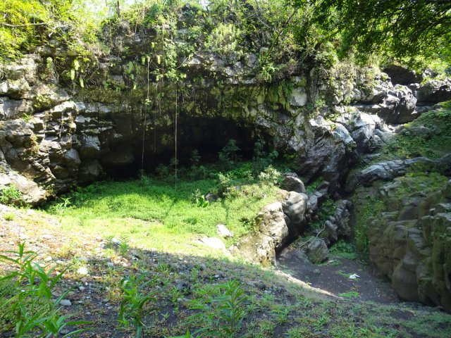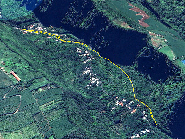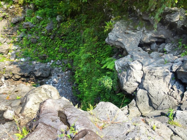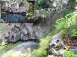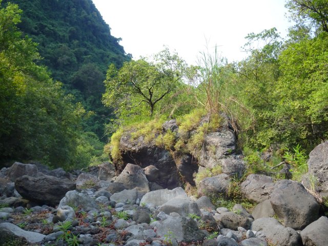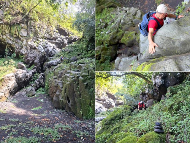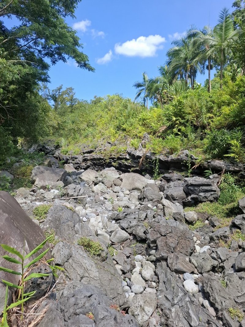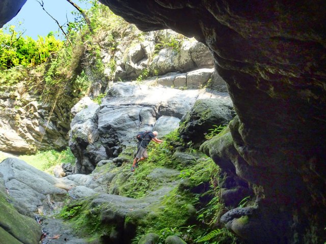 La randonnée débute ici sur l'ancienne route de Grand Galet, au plus près de la rivière. Se rapprocher de la rivière et marcher vers le barrage pour en étudier le fonctionnement. L'eau bifurque en rive gauche et se dirige vers le tunnel alimentant l'usine hydroélectrique. Repérer au passage le niveau de l'eau lors de certains cyclones dévastateurs (Photo 1). S'il y a beaucoup de débit, une partie de l'eau descend le lit qui, sinon devient sec car la priorité est donnée à l'usine. Depuis la digue, on peut voir immédiatement la différence (Photo 2). D'un côté l'eau limpide, de l'autre les flaques laissées par les pluies. C'est donc sur les éternels galets que débute cette randonnée. Le lit étant assez tourmenté, on y trouve des galets allant du ballon de rugby à la taille d'une voiture. Certains îlots rocheux n'ont pas encore pu être érodés (Photo 3). On croise des bassins sans fond, des roches, des cassés facilement franchissables (Photo 4). En grimpant le fossé en rive droite on arrive dans une longue faille à une dizaine de mètres de la rivière. On ne la voit pas en raison de la hauteur des murs moussus (Photo 5). La végétation des abords est principalement constituée de goyaviers et jamrosats créant des tunnels sombres (Photo 6). Les grottes, bouches de tunnel ou fissures ne sont pas en reste pour varier les paysages (Photo 7). Le premier grand bassin comporte des parties glissantes mais se contourne facilement. 100 m plus loin, on retrouve le fond rocheux. La marche est moins rapide que dans la faille mais il n'est pas toujours facile de traverser les fourrés et taillis (Photo 8). Un nouveau cassé précédé d'un étroit canyon se présente plus bas. C'est le grand bassin des Hirondelles. Avant de le traverser, remonter assez aisément les roches en rive gauche et marcher jusqu'aux cordes installées par les canyonistes pour effectuer une sortie quand il y a de l'eau. Attention à la descente glissante au retour (Photo 9). La descente du cassé commence par le canyon glissant où il est impératif de se tenir à la paroi (Photo 10). Une courte escalade en fin de canyon amène à un premier palier (Photo 11). Là aussi, la mousse impose de prendre son temps et de bien se maintenir à la roche (Photo 12). Il vaut mieux ne pas souffrir de vertige pour certains contournements (Photo 13). Ne pas chercher à descendre immédiatement au fond du bassin mais longer la falaise en rive gauche en passant près d'un magnifique affouche aux très longues racines. Une fois au fond on peut voir les hirondelles sortant de la grande grotte de l'autre côté (Photo 14). 5 minutes plus tard, on parvient à un nouveau cassé très facile à longer sans crainte (Photo 15). A nouveau, 5 minutes plus tard, on arrive au plus important bassin de la sortie, le Bassin à Jules. Impossible de descendre au fond immédiatement. Il faudra attendre d'être plus loin. Il est facile d'en suivre le haut sur les rochers assez stables (Photo 16). En restant toujours en rive gauche, on parvient là aussi aux câbles laissés par les professionnels pour descendre vers le Pont Babet (Photo 17). De cet endroit, on envie les sportifs qui finiront leur descente dans le Bassin à Jules, très profond, qu'il soit plein ou vide (Photo 18). Revenir sur ses pas de quelques mètres et trouver le long de la paroi des faiblesses permettant d'atteindre le fond du bassin qui domine celui à Jules. Une fois dans le canyon, on se régale du spectacle des parois, des interminables racines de Monstera délicieux, de la grotte du fond et du calme des lieux (Photo 19). Après une dernière photo depuis la grotte (Photo 20), revenir au point de faiblesse dominant le Bassin à Jules et remonter en rive gauche. Impossible de poursuivre sans cordes, aussi, reprendre le chemin inverse le long de la profonde faille (Photo 21). Remonter la rivière à sec et tenter de varier les paysages rencontrés lors de la descente. On retrouve les grosses roches bordées de jamrosats (Photo 22). On retrouve également des contournements sur les rives si l'on ne désire pas reprendre le fond de la rivière (Photo 23). Heureusement, pas de vigne marronne ou de galaberts qui pourraient abîmer les pieds (Photo 24) !! Les passages délicats délaissés dans la descente peuvent désormais se remonter plus sereinement en se méfiant tout de même de la mousse omniprésente (Photo 25). En délaissant la faille de contournement, on peut ainsi profiter de nouveaux paysages et de nouveaux canyons ou grottes. L'une d'entre elles est particulièrement profonde et dangereuse, imposant de retrouver les goyaviers pour un temps (Photo 26). C'est ainsi qu'on rencontre à nouveau le cassé présenté plus haut et évité par sécurité, car en descente. On peut ainsi repérer une ancienne arche, brisée par les éléments (Photo 27). Plus haut, un nouveau bassin doit se contourner (Photo 28) mais la petite route qui longe le réservoir de l'usine est proche et il est préférable de s'y rendre pour éviter de reprendre le lit de la rivière jusqu'au barrage. Il est facile de repérer des passages permettant de grimper le talus et se rapprocher de la haute grille. Prendre à gauche en direction de la Passerelle. Longer le long bassin, laisser l'école en ruine, puis traverser la passerelle sur la partie piéton avant d'emprunter l'ancienne route jusqu'au véhicule laissé en rive droite.