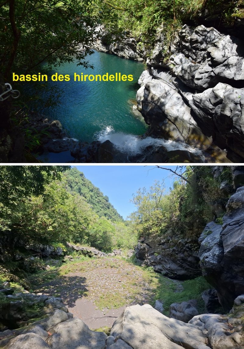 Une très belle randonnée explore les bassins et cascades de la Rivière Langevin en amont du village de la Passerelle. Cette fiche propose une nouvelle exploration en aval du barrage situé dans le village. Les sportifs habitués à ce genre de sorties aquatiques ou de fond de ravine, se réjouiront de les pratiquer toutes les deux le même jour. Cette dernière est plus facile en orientation, plus courte, mais demande tout de même un peu d'entraînement. On rencontre des bassins, des canyons parfois profonds, au sol glissant. Avant de s'y aventurer, étudier auparavant le relief et l'état du sol et ne se lancer qu'en étant certain de pouvoir en sortir. En cas de doute, trouver sur les rives le petit sentier ou la faille dans les rochers qui permettra de contourner l'obstacle et rejoindre les galets du cours d'eau à sec. Pour varier les plaisirs, une partie de cet aller-retour a été mixé entre fonds de rivières et berges à l'aller et en empruntant des variantes à la remontée car il est souvent plus facile de remonter un cassé que de le descendre. L'énorme Bassin des Hirondelles demande de ne pas souffrir de vertige et de bien assurer ses prises. Les deux derniers bassins sont impressionnants. Ils se contournent en rive gauche mais il est possible de descendre dans le premier rencontré. La descente prend fin aux cordes laissées par les canyonistes et aux pitons où ils s’accrochent pour rejoindre le dernier bassin, impossible à atteindre en simple randonnée. Ne pas pratiquer cette randonnée en cas de fortes pluies qui rendent le parcours dangereux.