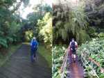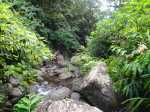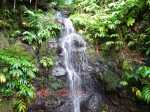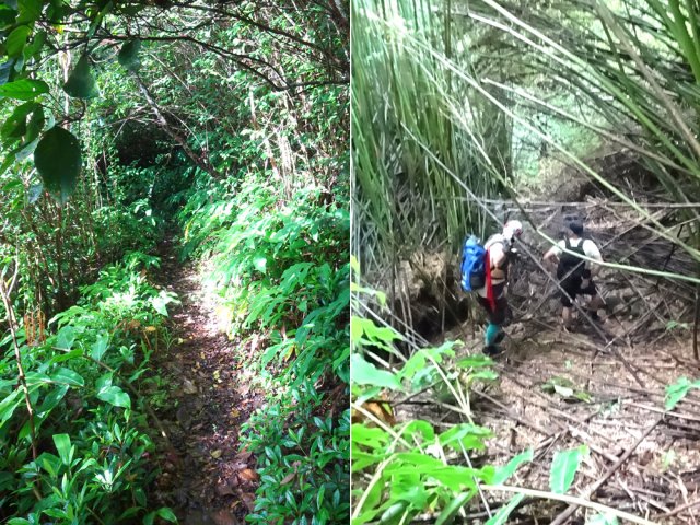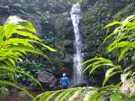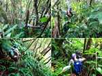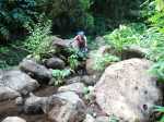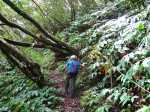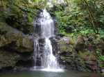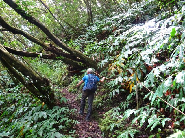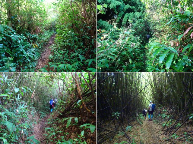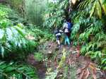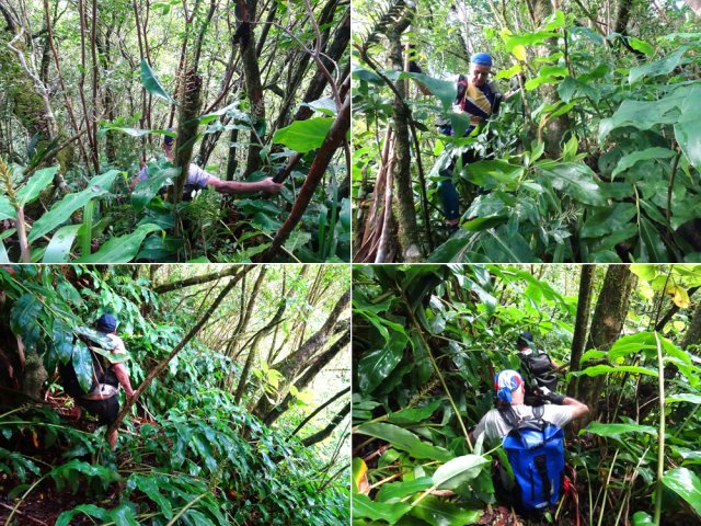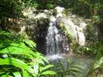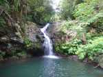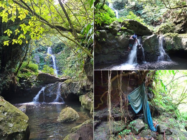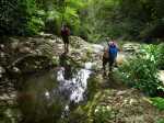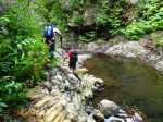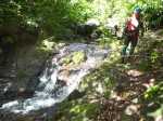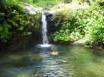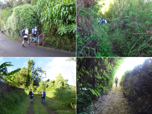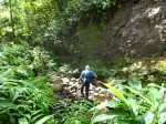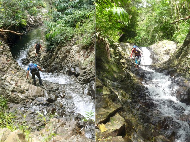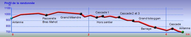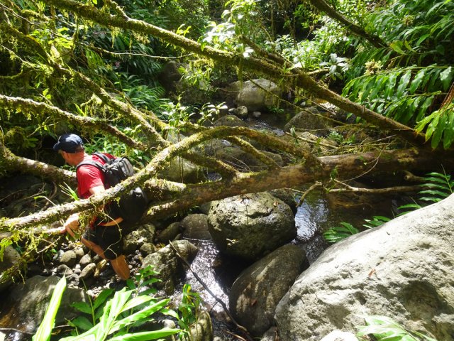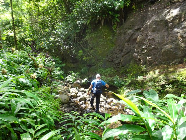 La randonnée débute à l'antenne, facile à trouver sur la droite de la route en direction de Mamode Camp. Quelques emplacements permettent de stationner au plus près de l'antenne. Marcher plein sud sur la route sur 150 m seulement (Photo 1). Le sentier Laverdure est facile à deviner grâce à ses deux rambardes blanches sur la gauche de la route. Le sentier est assez envahi mais il est parfois remplacé par des pistes desservant les habitations ou des chemins herbeux (Photo 2). On emprunte même une route bétonnée avant de se lancer pour plus de 30 minutes sur le sentier après avoir franchi la passerelle du Bras Mahot (Photo 3). Quand on connaît l'aventure qui approche, on profite de ce sentier même s'il est parfois étroit, glissant, envahi de bambous où il fait presque nuit (Photo 4). Le Petit Méandre se franchit sans même le remarquer. Le Grand Méandre est plus large. Il se traverse facilement pour reprendre le sentier glissant dans les longoses (Photo 5). Après cette ravine, les cryptomerias font leur apparition et la marche est plus agréable (Photo 6). La trace effectue de longs lacets. Passer le premier et se préparer à l'aventure qui se présente. Après le deuxième lacet, il est possible de se rapprocher de la Ravine du Butor pour atteindre le haut d'une première cascade. Se rapprocher de la ravine puis partir en hors sentier dans les touffes de bambous jusqu'au cours d'eau (Photo 7). Une petite cascade coule sur la droite mais la plus importante est en aval. On parvient très vite près de la chute sur un sol très glissant. Prendre garde pour en atteindre le haut d'où l'on aperçoit le bassin 15 m plus bas (Photo 8). Ces 15 m sont impossibles à franchir. Remonter alors le sentier et trouver, avant le lacet vers la gauche, un emplacement dans la végétation très touffue ; un semblant de trace. Quelques coups sur l'écorce montrent que des pêcheurs passent par là et laissent des repères, mais très difficiles à suivre. Il faut viser une crête entre le Grand Méandre et la Ravine du Butor et ne surtout pas chercher à descendre le rempart trop dangereux. Le cheminement doit décourager tous les novices en la matière qui pourrait les conduire dans un hélicoptère du PGHM (Photo 9). Attention, pas de réseau dans cette zone. Si on tente de se rapprocher du Grand Méandre, on longe ce rein et l'on trouve un câble électrique facilitant la descente d'une barre rocheuse près d'un gros arbre. Ce câble se termine à deux pas de la dernière cascade du Grand Méandre sur la gauche (Photo 10). La récompense se situe vers l'amont de la Ravine du Butor où l'on entend couler une chute en plusieurs paliers. Le premier est assez facile à remonter en se mouillant un peu (Photo 11). On se retrouve près d'une bâche sous laquelle s'abritent les pêcheurs en cas de pluie mais le campement semble abandonné. La chute principale poursuit sa course sans passer par un bassin (Photo 12). Entamer la descente le plus naturellement possible en cherchant toujours le meilleur passage (Photo 13). Pas de grosses difficultés même si certains rochers sont assez gros (Photo 14). La descente s'effectue en grande partie sur les berges ou dans le lit, les chaussures dans l'eau (Photo 15). Inutile de tenter de marcher les pieds au sec, surtout avec les roches très glissantes. Un nouveau bassin, plus modeste, permet une halte mais attention à la natation car le fond est proche (Photo 16). Les rives deviennent plus difficiles à suivre car les longoses poussent jusque dans l'eau. Repérer, en rive droite, une trace, sans doute créée par les débordements lors des crues. Elle ressemble à un sentier facile à suivre à condition de pousser les longoses et califons qui tentent de la boucher complètement (Photo 17). La trace prend fin à un nouveau bassin alimenté par une charmante cascade (Photo 18). Il est alors préférable de reprendre le cours d'eau même si certains obstacles offerts par le dernier cyclone peuvent ralentir un peu (Photo 19). On retrouve les galets, quelques petites falaises ou des éboulis ne ralentissant pas la descente (Photo 20). Peu de difficultés, mais prudence sur les plaques basaltiques très glissantes en raison de la mousse qui recouvre tout (Photo 21). Le cheminement amène à un toboggan finissant sa course dans un bassin. Près du bassin on remarque qu'il se termine en petite cascade. Le bassin est large et profond (Photo 22). Poursuivre, toujours sur ces plaques glissantes. On parvient à un nouveau toboggan qui n'incite pas à l'emprunter. Il faut simplement descendre en se servant des petites marches créées par les orgues volcaniques érodés (Photo 23). Après avoir longé le bassin, on rencontre de nouveaux ces toboggans (Photo 24). Les berges sont également constituées d'orgues qui facilitent le contournement des bassins (Photo 25). On parvient bientôt à la troisième cascade présentée sur la fiche 1988. Trouver, en rive gauche, une faiblesse dans le haut talus vertical et entamer la montée assez friable. L'effort est important pour dominer le bassin que l'on aperçoit sur la droite. Là aussi, difficile de repérer au premier coup d'œil les câbles cachés dans les longoses qui facilitent grandement la progression (Photo 26). Si on ne connaît pas cette cascade, prendre à droite dans la descente le discret sentier s'en approchant sinon poursuivre dans les longoses en direction du captage et sa passerelle. Aussitôt après la passerelle, emprunter le sentier bordé de câbles puis revenir au plus près de la ravine après une forte descente (Photo 27). Partir ou non vers l'amont pour 3 minutes de marche afin d' atteindre la haute cascade du captage (Photo 28). Retourner au gué facile à deviner par le câble traversant le lit. Frôler les installations et l'oratoire puis partir à gauche sur la RD43 jusqu'au parking à 100 m. Si aucun véhicule n'a été prévu, il faudra rajouter près d'une heure pour remonter à l'antenn