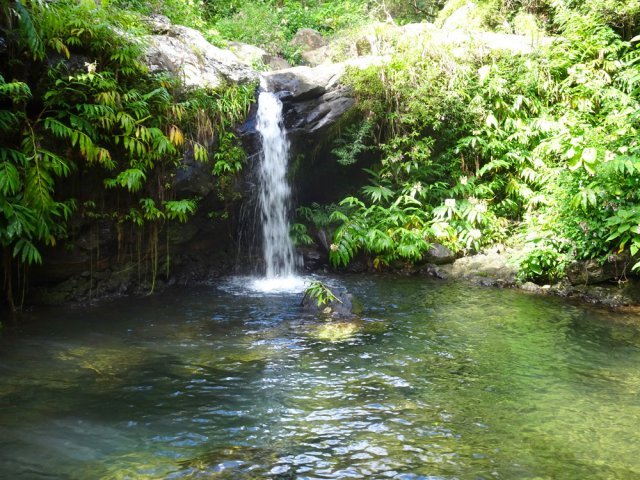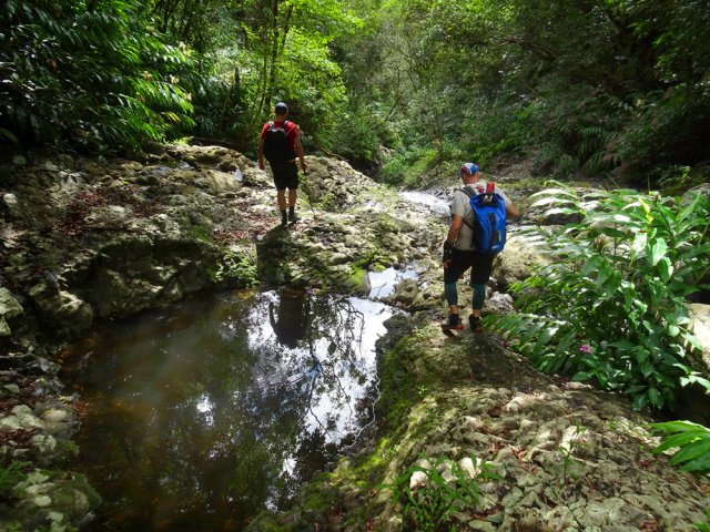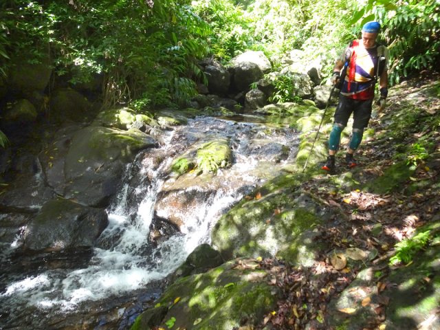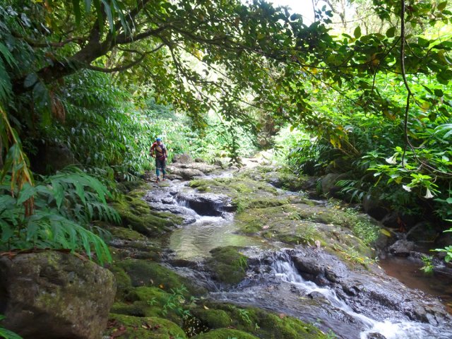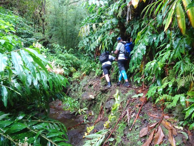 Une randonnée presque familiale présente 3 cascades à partir de la RD43. Celle-ci poursuit l'exploration à partir du Sentier Laverdure, plus au Sud. La première est une balade facile où des randonneurs ont pourtant du mal à trouver des sentiers bordés de longues mains courantes. Cette seconde randonnée demande un excellent entraînement physique et un sens de l'orientation tout aussi développé, en raison d'un total hors sentier ainsi que des contournements de bassins aléatoires. Le sentier Laverdure, de plus en plus bouché par la végétation semble une autoroute comparé à la deuxième partie plus aquatique. Une fois la ravine atteinte, on se retrouve devant les descentes habituelles de ravines souvent publiées sur ce site. Les cascades ne sont pas extraordinaires comme sur le Bras Laurent, la Rivière des Marsouins ou la Rivière Sainte-Suzanne mais toutes ont leur charme autant que la rivière elle-même, bordée de forêts profondes. La recrudescence de cas de leptospirose dans le département doit faire réfléchir sur la nécessité de se baigner dans les bassins rencontrés. Ne jamais partir seul sur cette sortie, avoir dans la poche un appareil lisant les traces GPS et gare aux glissades sur la mousse ou dans les contournements sur terrain friable (vécu !). La trace fournie ne reflète pas la réalité sur le terrain car le trait rouge saute d'une rive à l'autre. Des câbles électriques, judicieusement situés, facilitent les descentes à condition de les repérer car le noir du plastique n'est pas toujours évident dans les longoses. Au pont de la RD43, nous avons choisi de laisser un véhicule pour remonter au Brûlé. La remontée de 3400 m à l'antenne du Brûlé est presque toute en montée.