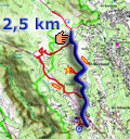 Lecture de la carte : Le trait rouge représente une étape pour laquelle aucune fiche n'est disponible ; en général, de courts transits sur route. Les traits verts et bleus montrent qu'un circuit est proposé sur le site, qu'il a été reconnu et qu'il peut être utilisé sans crainte. Les points jaunes et les lits marquent la fin d'une journée, au plus près d'un lieu d'hébergement